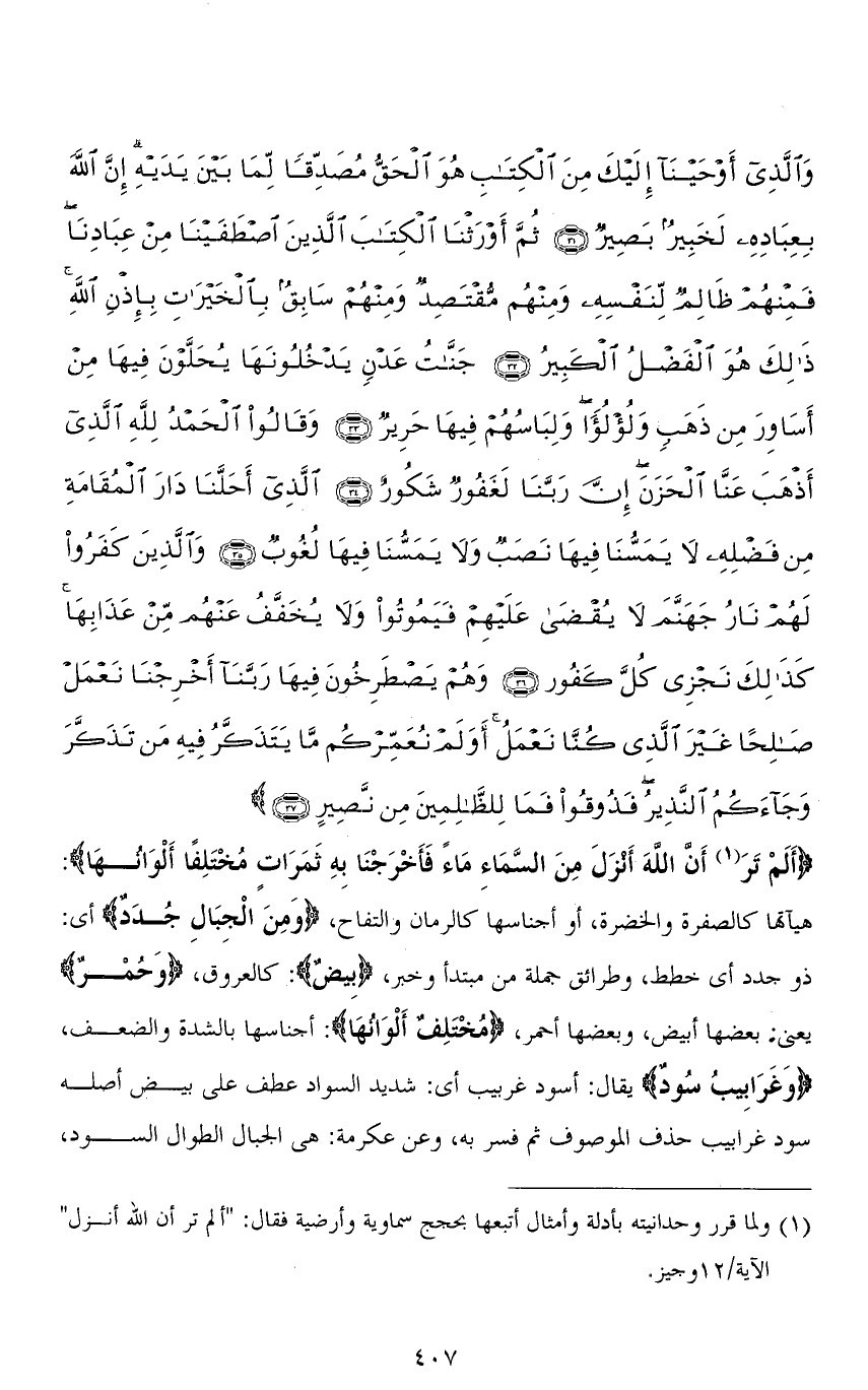 (أَلَمْ تَرَ أَنَّ اللهَ أَنْزَلَ مِنَ السَّمَاءِ مَاءً فَأَخْرَجْنَا بِهِ ثَمَرَاتٍ مُخْتَلِفًا أَلْوَانُهَا): هيآتها كالصفرة والخضرة، أو أجناسها كالرمان والتفاح، (وَمِنَ الْجِبَالِ جُدَدٌ) أي: ذو جدد أي خطط، وطرائق جملة من مبتدأ وخبر، (بِيضٌ): كالعروق، (وَحُمْرٌ) يعني: بعضها أبيض، وبعضها أحمر، (مُخْتَلِفٌ أَلْوَانُهَا): أجناسها بالشدة والضعف، (وَغَرَابِيبُ سُودٌ) يقال: أسود غربيب أي: شديد السواد عطف على بيض أصله سود غرابيب حذف الموصوف ثم فسر به، وعن عكرمة: هي الجبال الطوال السود،