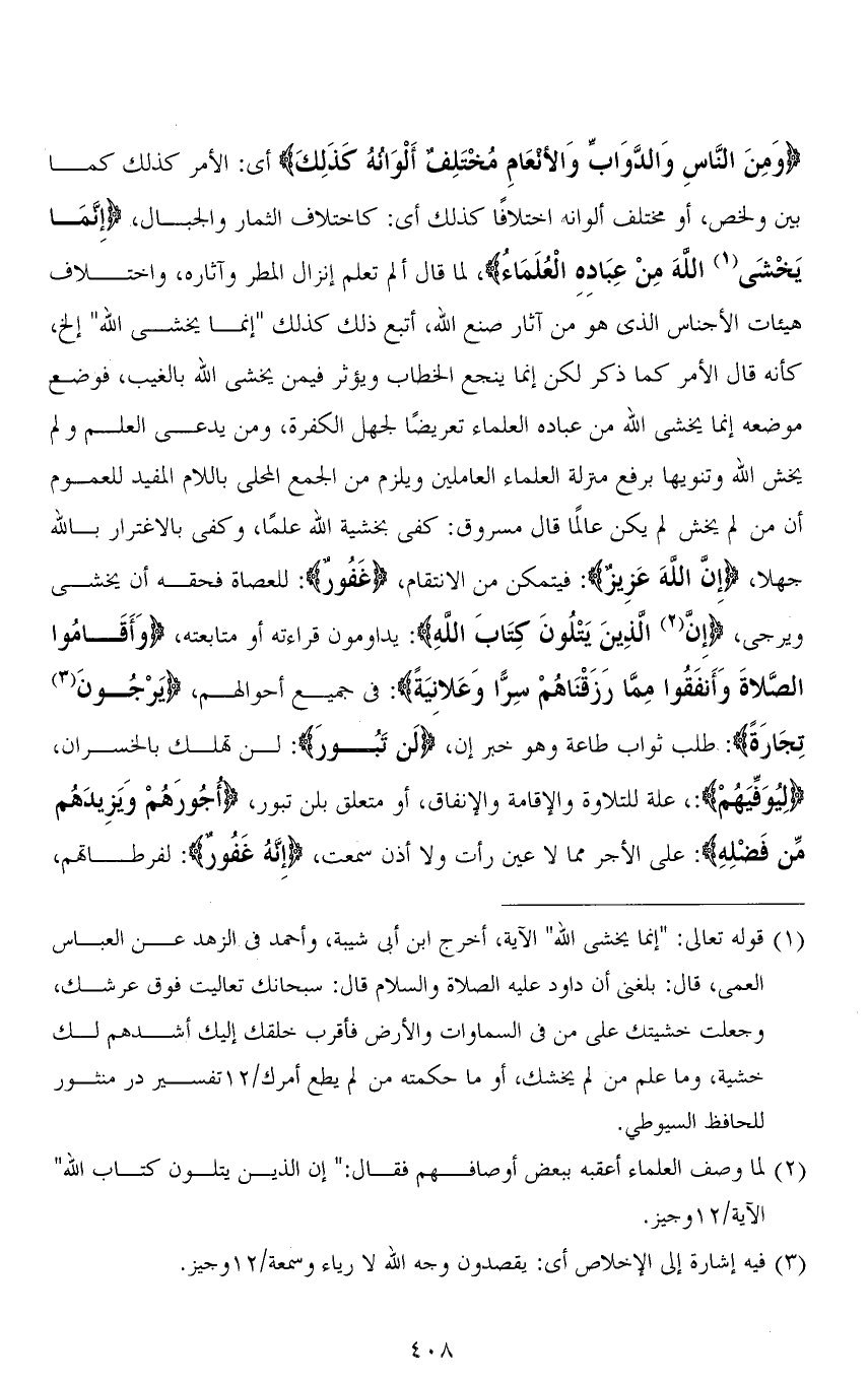 (وَمِنَ النَّاسِ وَالدَّوَابِّ وَالْأَنْعَامِ مُخْتَلِفٌ أَلْوَانُهُ كَذَلِكَ) أي: الأمر كذلك كما بين ولخص، أو مختلف ألوانه اختلافًا كذلك أي: كاختلاف الثمار والجبال، (إِنَّمَا يَخْشَى اللهَ مِنْ عِبَادِهِ الْعُلَمَاءُ)، لما قال ألم تعلم إنزال المطر وآثاره، واختلاف هيئات الأجناس الذي هو من آثار صنع الله، أتبع ذلك كذلك " إنما يخشى الله " إلخ، كأنه قال الأمر كما ذكر لكن إنما ينجع الخطاب ويؤثر فيمن في يخشى الله بالغيب، فوضع موضعه إنما يحشى الله من عباده العلماء تعريضًا لجهل الكفرة، ومن يدعي العلم ولم يخش الله وتنويها برفع منزلة العلماء العاملين ويلزم من الجمع المحلى باللام المفيد للعموم أن من لم يخش لم يكن عالمًا قال مسروق: كفى بخشية الله علمًا، وكفى بالاغترار بالله جهلا، (إِنَّ اللهَ عَزِيزٌ): فيتمكن من الانتقام، (غَفُورٌ): للعصاة فحقه أن يخشى ويرجى، (إِن الّذِينَ يَتْلُونَ كتَابَ اللهِ): يداومون قراءته أو متابعته، (وَأَقَامُوا الصَّلاةَ وَأَنْفَقُوا مِمَّا رَزَقْنَاهُمْ سِرًّا وَعَلَانِيَةً): في جميع أحوالهم، (يَرْجُونَ تِجَارَةً): يطلبون ثواب طاعة وهو خبر إن، (لَنْ تَبُورَ): لن تهلك بالخسران، (لِيُوَفِّيَهُمْ):، علة للتلاوة والإقامة والإنفاق، أو متعلق بـ لَنْ تَبُورَ، (أُجُورَهُمْ وَيَزِيدَهُم مِّن فَضْلِهِ): على الأجر مما لا عين رأت ولا أذن سمعت، (إِنَّهُ غَفُورٌ): لفرطاتهم،