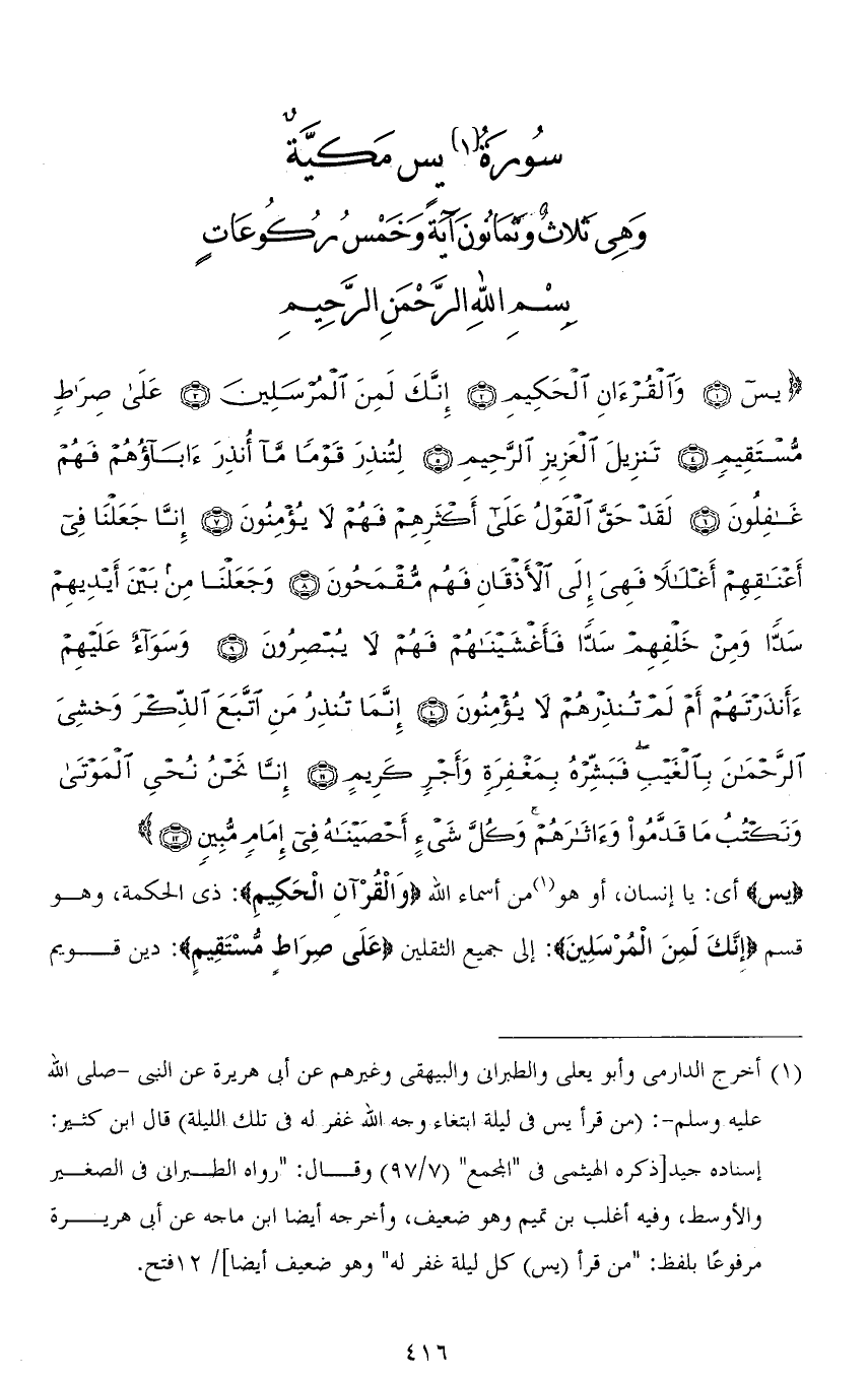 (يس (1) وَالْقُرْآنِ الْحَكِيمِ (2) إِنَّكَ لَمِنَ الْمُرْسَلِينَ (3) عَلَى صِرَاطٍ مُسْتَقِيمٍ (4) تَنْزِيلَ الْعَزِيزِ الرَّحِيمِ (5) لِتُنْذِرَ قَوْمًا مَا أُنْذِرَ آبَاؤُهُمْ فَهُمْ غَافِلُونَ (6) لَقَدْ حَقَّ الْقَوْلُ عَلَى أَكْثَرِهِمْ فَهُمْ لَا يُؤْمِنُونَ (7) إِنَّا جَعَلْنَا فِي أَعْنَاقِهِمْ أَغْلَالًا فَهِيَ إِلَى الْأَذْقَانِ فَهُمْ مُقْمَحُونَ (8) وَجَعَلْنَا مِنْ بَيْنِ أَيْدِيهِمْ سَدًّا وَمِنْ خَلْفِهِمْ سَدًّا فَأَغْشَيْنَاهُمْ فَهُمْ لَا يُبْصِرُونَ (9) وَسَوَاءٌ عَلَيْهِمْ أَأَنْذَرْتَهُمْ أَمْ لَمْ تُنْذِرْهُمْ لَا يُؤْمِنُونَ (10) إِنَّمَا تُنْذِرُ مَنِ اتَّبَعَ الذِّكْرَ وَخَشِيَ الرَّحْمَنَ بِالْغَيْبِ فَبَشِّرْهُ بِمَغْفِرَةٍ وَأَجْرٍ كَرِيمٍ (11) إِنَّا نَحْنُ نُحْيِ الْمَوْتَى وَنَكْتُبُ مَا قَدَّمُوا وَآثَارَهُمْ وَكُلَّ شَيْءٍ أَحْصَيْنَاهُ فِي إِمَامٍ مُبِينٍ (12)