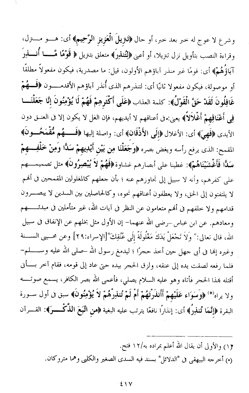 وشرع لا عوج له خبر بعد خبر، أو حال (تَنْزِيلَ الْعَزِيزِ الرَّحِيمِ) أي: هو منزل، وقراءة النصب بتأويل نزل تنزيلاً، أو أعني ولتُنذِرَ " متعلق بـ تَنْزِيلَ (قَوْمًا مَا أُنْذِرَ آبَاؤُهُمْ) أي: قومًا غير منذر آباؤهم الأولون، قيل: ما مصدرية، فيكون مفعولاً مطلقًا أو موصولة، فيكون مفعولاً ثانيًا أي: لتنذرهم الذي أُنذر آباؤهم الأقدمون (فَهُمْ غَافِلُونَ لَقَدْ حَقَّ الْقَوْلُ): كلمة العذاب (عَلَى أَكْثَرِهِمْ فَهُمْ لَا يُؤْمِنُونَ إِنَّا جَعَلْنَا فِي أَعْنَاقِهِمْ أَغْلَالًا) يعني: في أعناقهم لا أيديهم، فإن الغل لا يكون إلا في العنق دون الأيدي (فَهِيَ) أي: الأغلال (إِلَى الأَذْقَانِ) أي: واصلة إليها (فَهُم مقْمَحُونَ) المقمح: الذي يرفع رأسه ويغض بصره (وَجَعَلْنَا مِن بَيْنِ أَيْدِيهِمْ سَدًّا وَمِنْ خَلْفِهِمْ سَدًّا فَأَغْشَيْنَاهُمْ): غطينا على أبصارهم غشاوة (فَهُمْ لَا يُبْصِرُونَ) مثل تصميمهم على كفرهم، وأنه لا سبيل إلى تجاوزهم عنه، بأن جعلهم كالمغلولين المقمحين في أنهم لا يلتفتون إلى الحق، ولا يعطفون أعناقهم نحوه، وكالحاصلين بين السدين لا يبصرون قدامهم ولا خلفهم في أنَّهم متعامون عن النظر في آيات الله، غير متأملين في مبدئهم ومعادهم. عن ابن عباس - رضى الله عنهما - إن الأول مثل بخلهم عن الإنفاق في سبيل الله، قال تعالى: (وَلاَ تَجْعَلْ يَدَكَ مَغْلُولَةً إِلَى عُنُقِكَ) [الإسراء: 29] وعن محيي السنة وغيره إنَّهَا في أبي جهل حين أخذ حجرًا؛ ليدمغ رسول الله - صلى الله عليه وسلم - فلما رفعه لصقت يده إلى عنقه، ولزق الحجر بيده حتى عاد إلى قومه، فقام آخر بأني أقتله بهذا الحجر فأتاه وهو عليه السلام يصلي، فأعمى الله بصر الكافر، يسمع صوته ولا يراه (وَسَوَاءٌ عَلَيْهِمْ أَأَنْذَرْتَهُمْ أَمْ لَمْ تُنْذِرْهُمْ لَا يُؤْمِنُونَ) سبق في أول سورة البقرة (إِنَّمَا تُنذِرُ) أي: إنذارًا نافعًا يترتب عليه البغية (منِ اتَّبَعَ الذِّكْرَ): القرآن