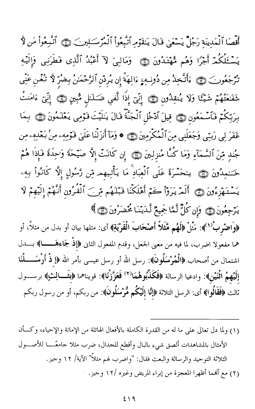أَقْصَا الْمَدِينَةِ رَجُلٌ يَسْعَى قَالَ يَا قَوْمِ اتَّبِعُوا الْمُرْسَلِينَ (20) اتَّبِعُوا مَنْ لَا يَسْأَلُكُمْ أَجْرًا وَهُمْ مُهْتَدُونَ (21) وَمَا لِيَ لَا أَعْبُدُ الَّذِي فَطَرَنِي وَإِلَيْهِ تُرْجَعُونَ (22) أَأَتَّخِذُ مِنْ دُونِهِ آلِهَةً إِنْ يُرِدْنِ الرَّحْمَنُ بِضُرٍّ لَا تُغْنِ عَنِّي شَفَاعَتُهُمْ شَيْئًا وَلَا يُنْقِذُونِ (23) إِنِّي إِذًا لَفِي ضَلَالٍ مُبِينٍ (24) إِنِّي آمَنْتُ بِرَبِّكُمْ فَاسْمَعُونِ (25) قِيلَ ادْخُلِ الْجَنَّةَ قَالَ يَا لَيْتَ قَوْمِي يَعْلَمُونَ (26) بِمَا غَفَرَ لِي رَبِّي وَجَعَلَنِي مِنَ الْمُكْرَمِينَ (27) وَمَا أَنْزَلْنَا عَلَى قَوْمِهِ مِنْ بَعْدِهِ مِنْ جُنْدٍ مِنَ السَّمَاءِ وَمَا كُنَّا مُنْزِلِينَ (28) إِنْ كَانَتْ إِلَّا صَيْحَةً وَاحِدَةً فَإِذَا هُمْ خَامِدُونَ (29) يَا حَسْرَةً عَلَى الْعِبَادِ مَا يَأْتِيهِمْ مِنْ رَسُولٍ إِلَّا كَانُوا بِهِ يَسْتَهْزِءُونَ (30) أَلَمْ يَرَوْا كَمْ أَهْلَكْنَا قَبْلَهُمْ مِنَ الْقُرُونِ أَنَّهُمْ إِلَيْهِمْ لَا يَرْجِعُونَ (31) وَإِنْ كُلٌّ لَمَّا جَمِيعٌ لَدَيْنَا مُحْضَرُونَ (32)