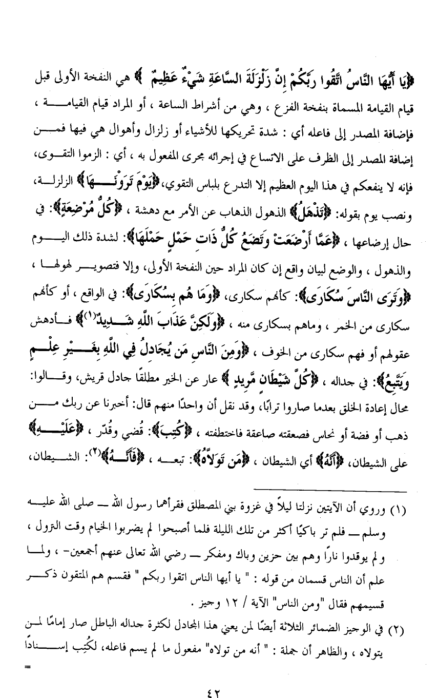 (يَا أَيُّهَا النَّاسُ اتَّقُوا رَبَّكُمْ إِنَّ زَلْزَلَةَ السَّاعَةِ شَيْءٌ عَظِيمٌ) هي النفخة الأولى قبل قيام القيامة المسماة بنفخة الفزع، وهي من أشراط الساعة، أو المراد قيام القيامة، فإضافة المصدر إلى فاعله أي: شدة تحريكها للأشياء أو زلزال وأهوال هي فيها فمن إضافة المصدر إلى الظرف على الاتساع في إجرائه مجرى المفعول به، أي: الزموا التقوى، فإنه لا ينفعكم في هذا اليوم العظيم إلا التدرع بلباس التقوي، (يَوْمَ تَرَوْنَهَا) الزلزلة، ونصب يوم بقوله: (تَذهَلُ) الذهول الذهاب عن الأمر مع دهشة، (كُلُّ مُرْضِعَةٍ): في حال إرضاعها، (عَمَّا أَرْضَعَتْ وَتَضَعُ كُلُّ ذَاتِ حَمْلٍ حَمْلَهَا): لشدة ذلك اليوم والذهول، والوضع لبيان واقع إن كان المراد حين النفخة الأولى، وإلا فتصوير لهولها، (وَتَرَى النَّاسَ سُكارَى): كأنهم سكارى، (وَمَا هُم بِسُكَارَى): في الواقع، أو كأنَّهم سكارى من الخمر، وما هم بسكارى منه، (وَلَكِنَّ عَذَابَ اللهِ شَدِيدٌ) فأدهش عقولهم أو فهم سكارى من الخوف، (وَمِنَ النَّاسِ مَن يُجَادِلُ فِي اللهِ بِغَيْرِ عِلْمٍ وَيَتبِعُ): في جداله، (كُلَّ شَيْطَانٍ مَرِيدٍ) عار عن الخير مطلقًا جادل قريش، وقالوا: محال إعادة الخلق بعدما صاروا ترابًا، وقد نقل أن واحدًا منهم قال: أخبرنا عن ربك من ذهب أو فضة أو نحاس فصعقته صاعقة فاختطفته، (كُتِبَ): قُضي وقُدّر، (عَلَيْهِ) على الشيطان، (أَنَّهُ) الشيطان، (مَنْ تَوَلَّاهُ): تبعه، (فَأَنَّهُ): الشيطان،
