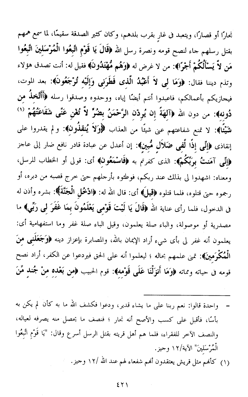 نجارًا أو قصارًا، ويتعبد في غارٍ بقرب بلدهم، وكان كثير الصدقة سقيمًا، لما سمع همهم بقتل رسلهم جاء لنصح قومه ونصرة رسل الله (قَالَ يَا قَوْمِ اتَّبِعُوا الْمُرْسَلِينَ اتَّبِعُوا مَنْ لَا يَسْأَلُكُمْ أَجْرًا): من لا غرض له (وَهُمْ مُهْتَدُونَ) فقيل له: أنت تصدق هؤلاء وتذم ديننا فقال: (وَمَا لِيَ لَا أَعْبُدُ الَّذِي فَطَرَنِي وَإِلَيْهِ تُرْجَعُونَ): بعد الموت، فيحازيكم بأعمالكم، فاعبدوا أنتم أيضًا إياه، ووحدوه وصدقوا رسله (أَأَتَّخِذُ مِنْ دُونِهِ): من دون الله (آلِهَةً إِنْ يُرِدْنِ الرَّحْمَنُ بِضُرٍّ لَا تُغْنِ عَنِّي شَفَاعَتُهُمْ شَيْئًا): لا تمنع شفاعتهم عني شيئًا من العذاب (وَلاَ يُنقِذُونِ): ولم يقدروا على إنقاذي (إِنِّي إِذًا لَفِي ضَلَالٍ مُبِينٍ): إن أعدل عن عبادة قادر نافع ضار إلى عاجز (إِنِّي آمَنتُ بِرَبِّكُمْ): الذي كفرتم به (فَاسْمَعُونِ) أي: قولي أو الخطاب للرسل، ومعناه: اشهدوا لي بذلك عند ربكم، فوطئوه بأرجلهم حتى خرج قصبه من دبره، أو رجموه حتى قتلوه، فلما قتلوه (قِيلَ) أي: قال الله له: (ادْخُلِ الجَنَّةَ): بشره وأذن له فى الدخول، فلما رأى عناية الله (قَالَ يَا لَيْتَ قَوْمِي يَعْلَمُونَ بِمَا غَفَرَ لِي رَبِّي) ما مصدرية أو موصولة، والباء صلة يعلمون، وقيل الباء صلة غفر وما استفهامية أي: يعلمون أنه غفر لي بأي شيء أراد الإيمان بالله، والمصابرة بإعزاز دينه (وَجَعَلَنِي مِنَ الْمُكْرَمِينَ): تمني علمهم بحاله؛ ليعلموا أنه على الحق فيردعوا عن الكفر، أراد نصح قومه في حياته ومماته (وَمَا أَنزَلْنَا عَلَى قَوْمِهِ): قوم [حبيب] (مِن بَعْدِهِ مِنْ جُندٍ منَ