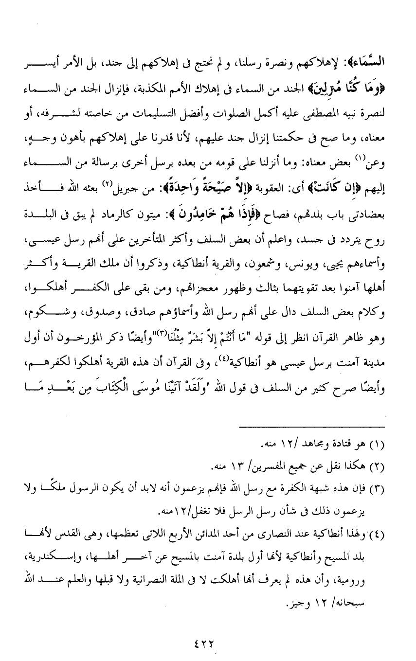 السَّماءِ): لإهلاكهم ونصرة رسلنا، ولم نحتج في إهلاكهم إلى جند، بل الأمر أيسر (وَمَا كُنَّا مُنْزِلِينَ) الجند من السماء في إهلاك الأمم المكذبة، فإنزال الجند من السماء لنصرة نبيه المصطفى عليه أكمل الصلوات وأفضل التسليمات من خاصته لشرفه، أو معناه، وما صح في حكمتنا إنزال جند عليهم، لأنا قدرنا على إهلاكهم بأهون وجهٍ، وعن بعض معناه: وما أنزلنا على قومه من بعده برسل أخرى برسالة من السماء إليهم (إِن كَانتْ) أي: العقوبة (إِلا صَيْحَةً وَاحِدَةً): من جبريل بعثه الله فأخذ بعضادتي باب بلدتهم، فصاح (فَإِذَا هُمْ خَامِدُونَ): ميتون كالرماد لم يبق في البلدة روح يتردد في جسد، واعلم أن بعض السلف وأكثر المتأخرين على أنَّهم رسل عيسى، وأسماءهم يحيى، ويونس، وشمعون، والقرية أنطاكية، وذكروا أن ملك القرية وأكثر أهلها آمنوا بعد تقويتهما بثالث وظهور معجزاتهم، ومن بقى على الكفر أهلكوا، وكلام بعض السلف دال على أنَّهم رسل الله وأسماؤهم صادق، وصدوق، وشكوم، وهو ظاهر القرآن انظر إلى قوله " مَا أَنتمْ إِلا بَشَرٌ مِثْلُنَا " وأيضًا ذكر المؤرخون أن أول مدينة آمنت برسل عيسى هو أنطاكية، وفي القرآن أن هذه القرية أهلكوا لكفرهم، وأيضًا صرح كثير من السلف في قول الله (وَلَقَدْ آتَيْنَا مُوسَى الْكِتَابَ مِنْ بَعْدِ مَا