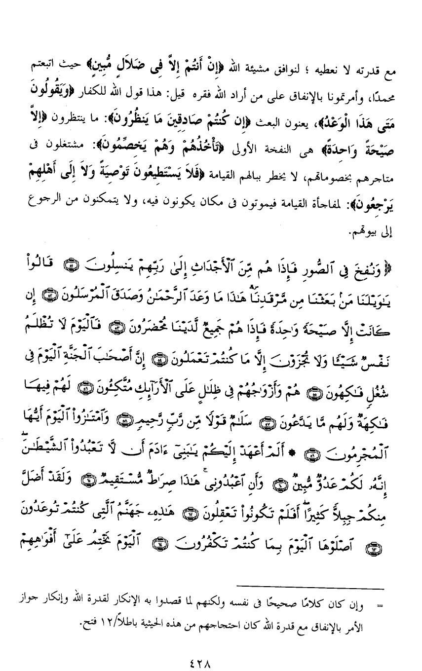 مع قدرته لا نعطيه؛ لنوافق مشيئة الله (إِنْ أَنْتُمْ إِلَّا فِي ضَلَالٍ مُبِينٍ) حيث اتبعتم محمدًا، وأمرتمونا بالإنفاق على من أراد الله فقره قيل: هذا قول الله للكفار (وَيَقُولونَ مَتَى هَذَا الْوَعْدُ)، يعنون البعث (إِن كنتُمْ صَادِقِينَ مَا يَنظُرونَ): ما ينتظرون (إِلا صَيْحَةً وَاحِدَةً) هي النفخة الأولى (تَأْخُذُهُمْ وَهُمْ يَخِصِّمُونَ): مشتغلون في متاجرهم بخصوماتهم، لا يخطر ببالهم القيامة (فَلَا يَسْتَطِيعُونَ تَوْصِيَةً وَلَا إِلَى أَهْلِهِمْ يَرْجِعُونَ): لمفاجأة القيامة فيموتون في مكان يكونون فيه، ولا يتمكنون من الرجوع إلى بيوتهم.