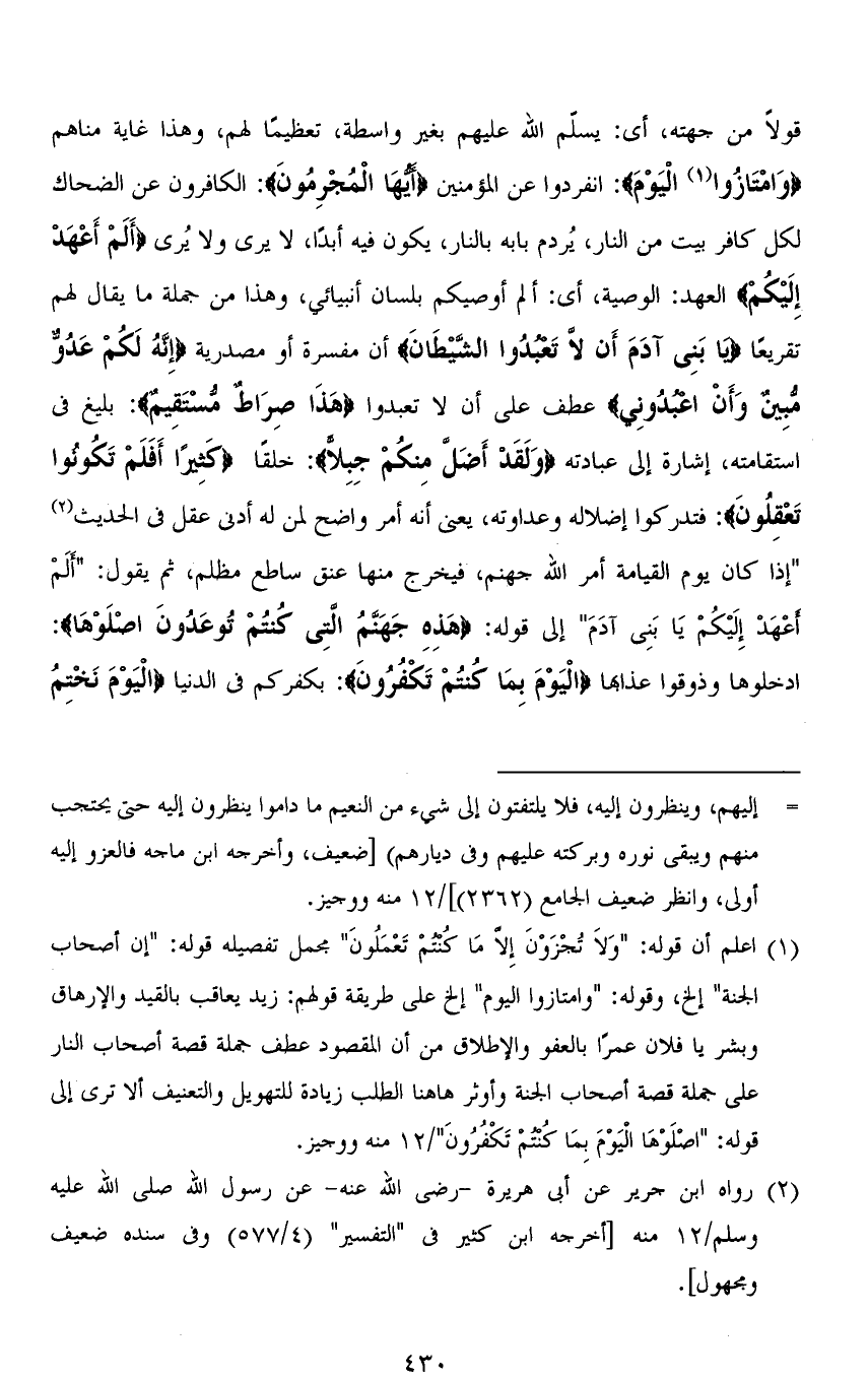 قولاً من جهته، أي: يسلِّم الله عليهم بغير واسطة، تعظيمًا لهم، وهذا غاية مناهم (وَامْتَازُوا الْيَوْمَ): انفردوا عن المؤمنين (أَيُّهَا الْمُجْرِمُونَ): الكافرون عن الضحاك لكل كافر بيت من النار، يُردم بابه بالنار، يكون فيه أبدًا، لا يرى ولا يُرى (أَلَمْ أَعْهَدْ إِلَيْكُمْ) العهد: الوصية، أي: ألم أوصيكم بلسان أنبيائي، وهذا من جملة ما يقال لهم تقريعًا (يَا بَنِي آدَمَ أَنْ لَا تَعْبُدُوا الشَّيْطَانَ) أن مفسرة أو مصدرية (إِنَّهُ لَكُمْ عَدُوٌّ مبِينٌ وَأَنِ اعْبُدُونِي) عطف على أن لا تعبدوا (هَذَا صِرَاطٌ مسْتَقِيمٌ): بليغ في استقامته، إشارة إلى عبادته (وَلَقَدْ أَضَلَّ مِنْكُمْ جِبِلًّا): خلقَا (كَثِيرًا أَفَلَمْ تَكُونُوا تَعْقِلُونَ): فتدركوا إضلاله وعداوته، يعني أنه أمر واضح لمن له أدنى عقل في الحديث " إذا كان يوم القيامة أمر الله جهنم، فيخرج منها عنق ساطع مظلم، ثم يقول: " ألَمْ أعْهَدْ إِلَيْكُمْ يَا بَنِى آدَمَ " إلى قوله: (هَذِهِ جَهَنَّمُ الَّتِي كُنْتُمْ تُوعَدُونَ اصْلَوْهَا): ادخلوها وذوقوا عذابها (الْيَوْمَ بِمَا كُنتُمْ تَكْفُرُونَ): بكفركم في الدنيا (الْيَوْمَ نَخْتِمُ
