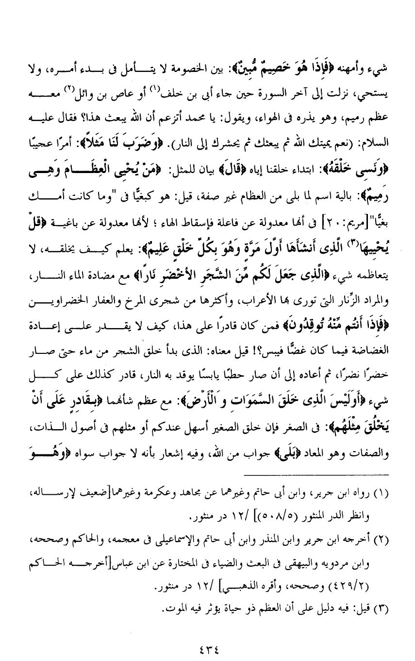 شيء وأمهنه (فَإِذَا هُوَ خَصِيمٌ مُبِينٌ): بين الخصومة لا يتأمل في بدء أمره، ولا يستحي، نزلت إلى آخر السورة حين جاء أبي بن خلف أو العاص بن وائل معه عظم رميم، وهو يذره في الهواء، ويقول: يا محمد أتزعم أن الله يبعث هذا؟ فقال عليه السلام: (نعم يميتك الله ثم يبعثك ثم يحشرك إلى النار). (وَضَرَبَ لنا مَثَلاً)؛ أمرًا عجيبًا (وَنَسِيَ خَلْقَهُ): ابتداء خلقنا إياه (قَالَ) بيان للمثل: (مَنْ يُحْييِ الْعِظَامَ وَهِيَ رَمِيمٌ): بالية اسم لما بلى من العظام غير صفة، قيل: هو كـ بغيًّا في " وَمَا كَانَتْ أُمُّكِ بَغِيًّا " [مريم: 20] في أنها معدولة عن فاعلة فإسقاط الهاء؛ لأنها معدولة عن باغية (قُلْ يُحْيِيهَا الَّذِي أَنْشَأَهَا أَوَّلَ مَرَّةٍ وَهُوَ بِكُلِّ خَلْقٍ عَلِيمٌ): يعلم كيف يخلقه، لا يتعاظمه شيء (الَّذِي جَعَلَ لَكم مِّنَ الشًّجَرِ الأخْضَرِ نَارًا) مع مضادة الماء النار، والمراد الزِّنار التي تورى بها الأعراب، وأكثرها من شجري المرخ والعفار الخضراوين (فَإِذَا أَنْتُمْ مِنْهُ تُوقِدُونَ) فمن كان قادرًا على هذا، كيف لا يقدر على إعادة الغضاضة فيما كان غضًّا فيبس؟! قيل معناه: الذي بدأ خلق الشجر من ماء حتى صار خضرًا نضرًا، ثم أعاده إلى أن صار حطبًا يابسًا يوقد به النار، قادر كذلك على كل شيء (أَوَلَيْسَ الَّذِي خَلَقَ السَّمَاوَاتِ وَالْأَرْضَ): مع عظم شأنهما (بِقَادِرٍ عَلَى أَنْ يَخْلُقَ مِثْلَهُم): في الصغر فإن خلق الصغير أسهل عندكم أو مثلهم في أصول الذات، والصفات وهو المعاد (بَلَى) جواب من الله، وفيه إشعار بأنه لا جواب سواه (وَهوَ