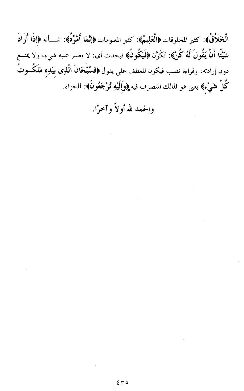 الْخَلَّاقُ): كثير المخلوقات (الْعَلِيمُ): كثير المعلومات (إِنَّمَا أَمْرُهُ): شأنه (إِذَا أَرَادَ شَيْئًا أَنْ يَقُولَ لَهُ كُنْ): تَكَوَّن (فَيَكُونُ) فيحدث أي: لا يعسر عليه شيء، ولا يمنع دون إرادته، وقراءة نصب فيكون للعطف على يقول (فَسُبْحَانَ الَّذِي بِيَدِهِ مَلَكُوتُ كُلِّ شَيْءٍ) يعني هو المالك المتصرف فيه (وَإِلَيْهِ تُرْجَعُونَ): للجزاء.