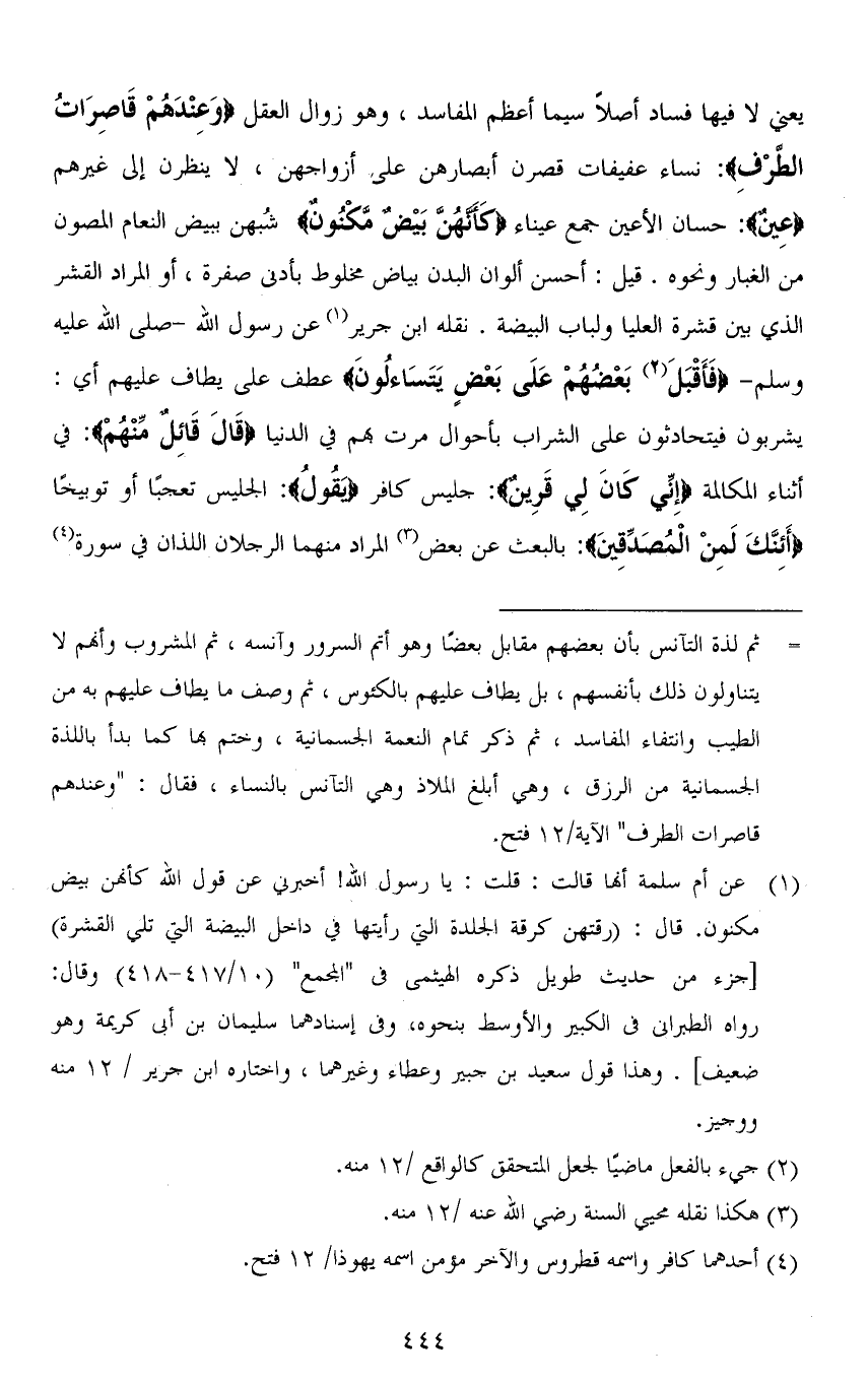 يعني لا فيها فساد أصلاً سيما أعظم المفاسد، وهو زوال العقل (عِنْدَهُمْ قَاصِرَاتُ الطَّرْفِ): نساء عفيفات قصرن أبصارهن على أزواجهن، لا ينظرن إلى غيرهم (عِينٌ): حسان الأعين جمع عيناء (كَأَنَّهُنَّ بَيْضٌ مَكْنُونٌ) شُبهن ببيض النعام المصون من الغبار ونحوه. قيل: أحسن ألوان البدن بياض مخلوط بأدنى صفرة، أو المراد القشعر الذي بين قشرة العليا ولباب البيضة. نقله ابن جرير عن رسول الله - صلى الله عليه وسلم - (فَأَقْبَلَ بَعْضُهُمْ عَلَى بَعْضٍ يَتَسَاءَلُونَ) عطف على يطاف عليهم أي: يشربون فيتحادثون على الشراب بأحوال مرت بهم في الدنيا (قَالَ قَائِلٌ مِنْهُمْ): في أثناء المكالمة (إِنِّي كَانَ لِي قَرِينٌ): جليس كافر (يقُولُ): الجليس تعجبًا أو توبيحًا (أَإِنَّكَ لَمِنَ الْمُصَدِّقِينَ): بالبعث عن بعض المراد منهما الرجلان اللذان في سورة
