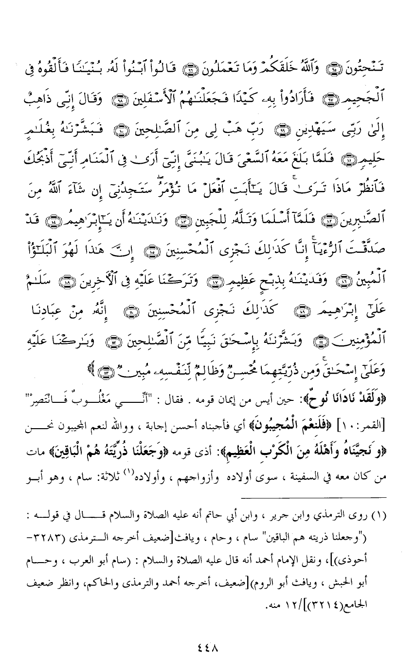 تَنْحِتُونَ (95) وَاللهُ خَلَقَكُمْ وَمَا تَعْمَلُونَ (96) قَالُوا ابْنُوا لَهُ بُنْيَانًا فَأَلْقُوهُ فِي الْجَحِيمِ (97) فَأَرَادُوا بِهِ كَيْدًا فَجَعَلْنَاهُمُ الْأَسْفَلِينَ (98) وَقَالَ إِنِّي ذَاهِبٌ إِلَى رَبِّي سَيَهْدِينِ (99) رَبِّ هَبْ لِي مِنَ الصَّالِحِينَ (100) فَبَشَّرْنَاهُ بِغُلَامٍ حَلِيمٍ (101) فَلَمَّا بَلَغَ مَعَهُ السَّعْيَ قَالَ يَا بُنَيَّ إِنِّي أَرَى فِي الْمَنَامِ أَنِّي أَذْبَحُكَ فَانْظُرْ مَاذَا تَرَى قَالَ يَا أَبَتِ افْعَلْ مَا تُؤْمَرُ سَتَجِدُنِي إِنْ شَاءَ اللهُ مِنَ الصَّابِرِينَ (102) فَلَمَّا أَسْلَمَا وَتَلَّهُ لِلْجَبِينِ (103) وَنَادَيْنَاهُ أَنْ يَا إِبْرَاهِيمُ (104) قَدْ صَدَّقْتَ الرُّؤْيَا إِنَّا كَذَلِكَ نَجْزِي الْمُحْسِنِينَ (105) إِنَّ هَذَا لَهُوَ الْبَلَاءُ الْمُبِينُ (106) وَفَدَيْنَاهُ بِذِبْحٍ عَظِيمٍ (107) وَتَرَكْنَا عَلَيْهِ فِي الْآخِرِينَ (108) سَلَامٌ عَلَى إِبْرَاهِيمَ (109) كَذَلِكَ نَجْزِي الْمُحْسِنِينَ (110) إِنَّهُ مِنْ عِبَادِنَا الْمُؤْمِنِينَ (111) وَبَشَّرْنَاهُ بِإِسْحَاقَ نَبِيًّا مِنَ الصَّالِحِينَ (112) وَبَارَكْنَا عَلَيْهِ وَعَلَى إِسْحَاقَ وَمِنْ ذُرِّيَّتِهِمَا مُحْسِنٌ وَظَالِمٌ لِنَفْسِهِ مُبِينٌ (113)