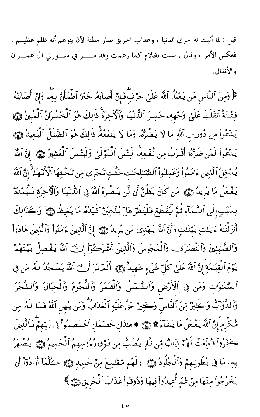 (وَمِنَ النَّاسِ مَنْ يَعْبُدُ اللهَ عَلَى حَرْفٍ فَإِنْ أَصَابَهُ خَيْرٌ اطْمَأَنَّ بِهِ وَإِنْ أَصَابَتْهُ فِتْنَةٌ انْقَلَبَ عَلَى وَجْهِهِ خَسِرَ الدُّنْيَا وَالْآخِرَةَ ذَلِكَ هُوَ الْخُسْرَانُ الْمُبِينُ (11) يَدْعُو مِنْ دُونِ اللهِ مَا لَا يَضُرُّهُ وَمَا لَا يَنْفَعُهُ ذَلِكَ هُوَ الضَّلَالُ الْبَعِيدُ (12) يَدْعُو لَمَنْ ضَرُّهُ أَقْرَبُ مِنْ نَفْعِهِ لَبِئْسَ الْمَوْلَى وَلَبِئْسَ الْعَشِيرُ (13) إِنَّ اللهَ يُدْخِلُ الَّذِينَ آمَنُوا وَعَمِلُوا الصَّالِحَاتِ جَنَّاتٍ تَجْرِي مِنْ تَحْتِهَا الْأَنْهَارُ إِنَّ اللهَ يَفْعَلُ مَا يُرِيدُ (14) مَنْ كَانَ يَظُنُّ أَنْ لَنْ يَنْصُرَهُ اللهُ فِي الدُّنْيَا وَالْآخِرَةِ فَلْيَمْدُدْ بِسَبَبٍ إِلَى السَّمَاءِ ثُمَّ لْيَقْطَعْ فَلْيَنْظُرْ هَلْ يُذْهِبَنَّ كَيْدُهُ مَا يَغِيظُ (15) وَكَذَلِكَ أَنْزَلْنَاهُ آيَاتٍ بَيِّنَاتٍ وَأَنَّ اللهَ يَهْدِي مَنْ يُرِيدُ (16) إِنَّ الَّذِينَ آمَنُوا وَالَّذِينَ هَادُوا وَالصَّابِئِينَ وَالنَّصَارَى وَالْمَجُوسَ وَالَّذِينَ أَشْرَكُوا إِنَّ اللهَ يَفْصِلُ بَيْنَهُمْ يَوْمَ الْقِيَامَةِ إِنَّ اللهَ عَلَى كُلِّ شَيْءٍ شَهِيدٌ (17) أَلَمْ تَرَ أَنَّ اللهَ يَسْجُدُ لَهُ مَنْ فِي السَّمَاوَاتِ وَمَنْ فِي الْأَرْضِ وَالشَّمْسُ وَالْقَمَرُ وَالنُّجُومُ وَالْجِبَالُ وَالشَّجَرُ وَالدَّوَابُّ وَكَثِيرٌ مِنَ النَّاسِ وَكَثِيرٌ حَقَّ عَلَيْهِ الْعَذَابُ وَمَنْ يُهِنِ اللهُ فَمَا لَهُ مِنْ مُكْرِمٍ إِنَّ اللهَ يَفْعَلُ مَا يَشَاءُ (18) هَذَانِ خَصْمَانِ اخْتَصَمُوا فِي رَبِّهِمْ فَالَّذِينَ كَفَرُوا قُطِّعَتْ لَهُمْ ثِيَابٌ مِنْ نَارٍ يُصَبُّ مِنْ فَوْقِ رُءُوسِهِمُ الْحَمِيمُ (19) يُصْهَرُ بِهِ مَا فِي بُطُونِهِمْ وَالْجُلُودُ (20) وَلَهُمْ مَقَامِعُ مِنْ حَدِيدٍ (21) كُلَّمَا أَرَادُوا أَنْ يَخْرُجُوا مِنْهَا مِنْ غَمٍّ أُعِيدُوا فِيهَا وَذُوقُوا عَذَابَ الْحَرِيقِ (22)