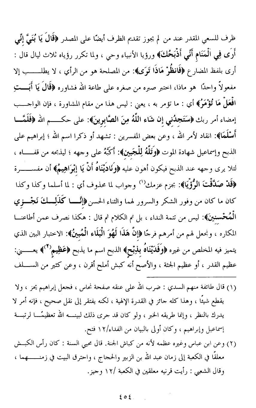ظرف للسعي المقدر عند من لم يجوز تقدم الظرف أيضًا على المصدر (قَالَ يَا بُنَيَّ إِنِّي أَرَى فِي الْمَنَامِ أَنِّي أَذْبَحُكَ) ورؤيا الأنبياء وحي، ولما تكرر رؤياه ثلاث ليال قال: أرى بلفظ المضارع (فانظُرْ مَاذَا تَرَى): من المصلحة هو من الرأي، لا يطلب إلا مفعولاً واحدًا هو ماذا، اختبر صبره من صغره على طاعة الله فشاوره (قَالَ يَا أَبَتِ افْعَلْ مَا تُؤْمَرُ) أي: ما تؤمر به، يعني: ليس هذا من مقام المشاورة، فإن الواجب إمضاء أمر ربك (سَتَجِدُنِي إِنْ شَاءَ اللهُ مِنَ الصَّابِرِينَ): على حكم الله (فَلَمَّا أَسْلَمَا): انقاد لأمر الله، وعن بعض المفسرين: تشهد أو ذكرا اسم الله؛ إبراهيم على الذبح وإسماعيل شهادة الموت (وَتَلَّهُ لِلْجَبِينِ): أكبَّهُ على وجهه؛ ليذبحه من قفاه، لئلا يرى وجهه عند الذبح فيكون أهون عليه (وَنَادَيْنَاهُ أَنْ يَا إِبْرَاهِيمُ) أن مفسرة (قَدْ صَدَّقْتَ الرُّؤْيَا): بجزم عزمك وجواب لا محذوف أي: لما أسلما وكذا وكذا كان ما كان من وفور الشكر والسرور لهما والثناء الحسن (إِنَّا كَذَلِكَ نَجْزِي الْمُحْسِنِينَ): ليس من تتمة النداء، بل تم الكلام ثم قال: هكذا نصرف عمن أطاعنا المكاره، ونجعل لهم من أمرهم فرجًا (إِنَّ هَذَا لَهُوَ الْبَلَاءُ الْمُبِينُ): الاختبار البين الذي يتميز فيه المخلص من غيره (وَفَدَيْنَاهُ بِذِبْحٍ) لذبح اسم بها يذبح (عَظِيمٍ) يعني: عظيم القدر، أو عظيم الجثة، والأصح أنه كبش أملح أقرن، وعن كثير من السلف