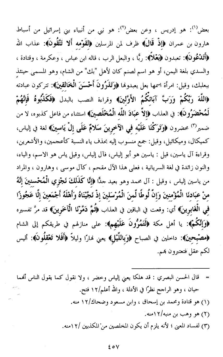 بعض: هو إدريس، وعن بعض: هو نبي من أنبياء بني إسرائيل من أسباط هارون بن عمران (إِذ قَاْلَ) ظرف لمن المرسلين (لِقَوْمِهِ أَلا تَتَّقُون): عذاب الله (أَتَدْعُون): تعبدون (بعْلاً): ربًّا، والبعل الرب، قاله ابن عباس، وعكرمة، وقتادة، والسدي بلغة اليمن، أو هو اسم لصنم كان لأهل " بك " من الشام، وهو المسمى حينئذٍ ببعلبك، وقيل: امرأة اسمها بعل يعبدونها (وَتَذَرُونَ أَحْسَنَ الْخَالِقِينَ): تتركون عبادته (اللهَ رَبَّكُمْ وَرَبَّ آبَائِكُمُ الْأَوَّلِينَ) وقراءة النصب بالبدل (فَكَذَّبُوهُ فَإِنَّهُمْ لَمُحْضَرُونَ): في العذاب (إِلا عِبَادَ اللهِ الْمُخْلَصِينَ) استثناء من فاعل كذبوه، لا من ضمير محضرون (وَتَرَكْنَا عَلَيْهِ فِي الْآخِرِينَ سَلَامٌ عَلَى إِلْ يَاسِينَ) لغة في إلياس، كميكال، وميكائيل، وقيل: جمع منسوب إليه بحذف ياء النسبة كأعجمين، والأشعرين، وقراءة آل ياسين، قيل: ياسين هو أبو إلياس، فآل إلياس، وقيل ياس هو الاسم، والياء، والنون زائدة في لغة السريانية، فعلى هذا الآل مقحم، كآل موسى، وهارون، والمراد من ياسين إلياس، وقيل: آل محمد وهو بعيد جدًّا (إِنَّا كَذَلِكَ نَجْزِي الْمُحْسِنِينَ إِنَّهُ مِنْ عِبَادِنَا الْمُؤْمِنِينَ وَإِنَّ لُوطًا لَمِنَ الْمُرْسَلِينَ إِذْ نَجَّيْنَاهُ وَأَهْلَهُ أَجْمَعِينَ إِلَّا عَجُوزًا فِي الْغَابِرِينَ) أي: وقعت في الباقين في العذاب (ثُمَّ دَمَّرْنَا الْآخَرِينَ) قد مرَّ تفسيره (وَإِنَّكُمْ): يا أهل مكة (لَتَمُرُّونَ عَلَيْهِمْ): على منازلهم في طريقكم إلى الشام (مُصْبِحِينَ): داخلين في الصباح (وَبِاللَّيْلِ) يعني نهارًا وليلاً (أَفَلَا تَعْقِلُونَ): أليس لكم عقل فتعتبرون بهم.