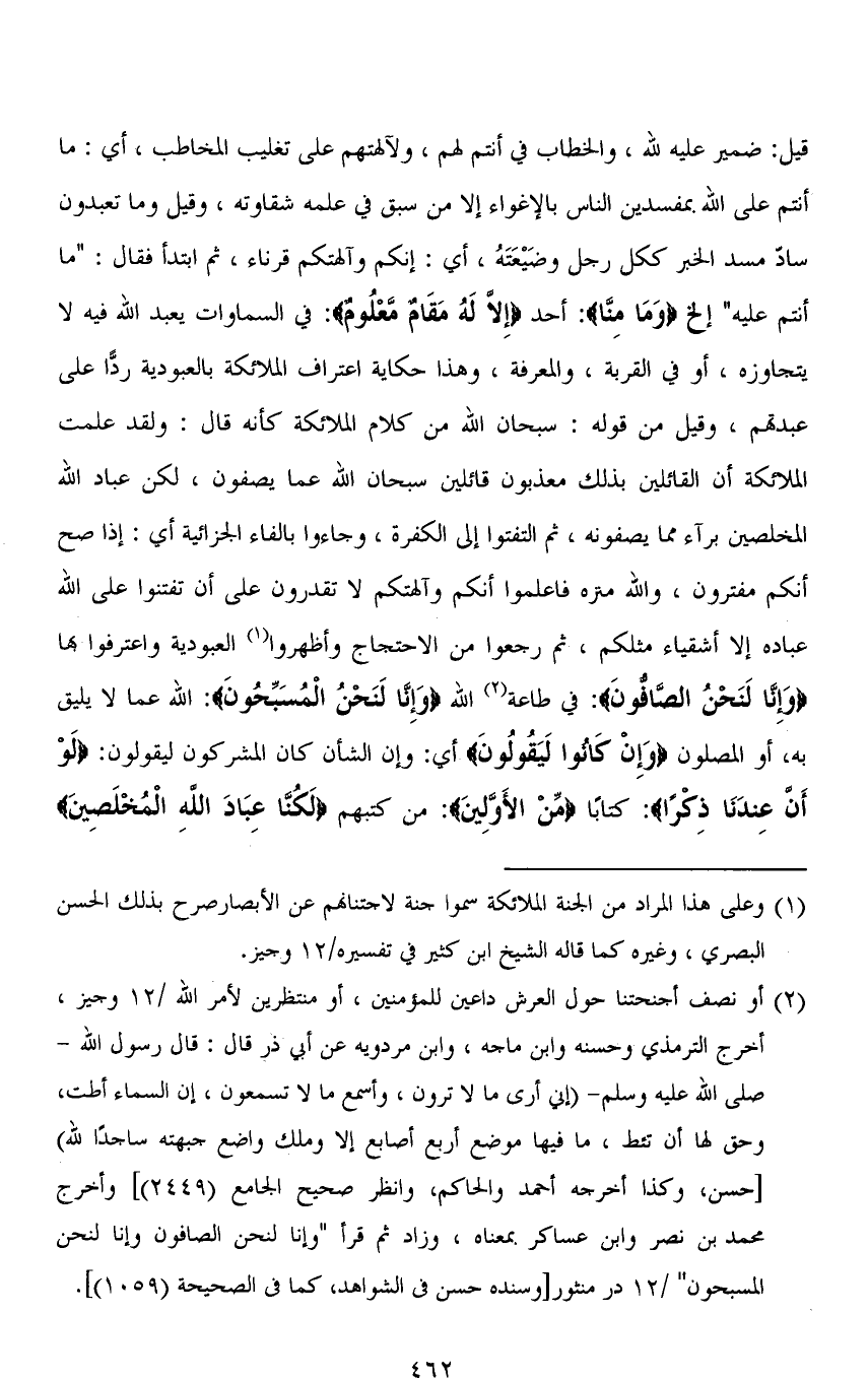 قيل: ضمير عليه لله، والخطاب في أنتم لهم، ولآلهتهم على تغليب المخاطب، أي: ما أنتم على الله بمفسدين الناس بالإغواء إلا من سبق في علمه شقاوته، وقيل وما تعبدون سادّ مسد الخبر ككل رجل وضَيْعَتَهُ، أي: إنكم وآلهتكم قرناء، ثم ابتدأ فقال: " ما أنتم عليه " إلخ (وَمَا مِنَّا): أحد (إِلَّا لَهُ مَقَامٌ مَعْلُومٌ): في السماوات يعبد الله فيه لا يتجاوزه، أو في القربة، والمعرفة، وهذا حكاية اعتراف الملائكة بالعبودية ردًّا على عبدتهم، وقيل من قوله: سبحان الله من كلام الملائكة كأنه قال: ولقد علمت الملائكة أن القائلين بذلك معذبون قائلين سبحان الله عما يصفون، لكن عباد الله المخلصين برآء مما يصفونه، ثم التفتوا إلى الكفرة، وجاءوا بالفاء الجزائية أي: إذا صح أنكم مفترون، والله منزه فاعلموا أنكم وآلهتكم لا تقدرون على أن تفتنوا على الله عباده إلا أشقياء مثلكم، ثم رجعوا من الاحتجاج وأظهروا العبودية واعترفوا بها (وَإِنَّا لَنَحْنُ الصَّافُّونَ): في طاعة الله (وَإِنَّا لَنَحْنُ الْمُسَبِّحُونَ): الله عما لا يليق به، أو المصلون (وَإِنْ كَانُوا لَيَقُولُونَ) أي: وإن الشأن كان المشركون ليقولون: (لَوْ أَنَّ عِندَنَا ذِكْرًا): كتابًا (مِّنْ الأَوَّلِينَ): من كتبهم (لَكُنَّا عِبَادَ اللهِ الْمُخْلَصِينَ)