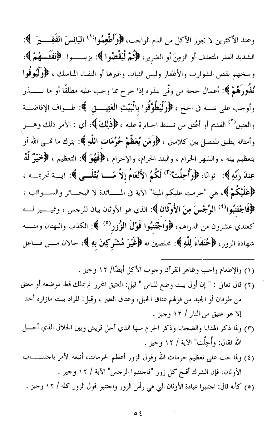 وعند الأكثرين لا يجوز الأكل من الدم الواجب، (وَأَطْعِمُوا الْبَائِسَ الْفَقِيرَ): الشديد الفقر المتعفف أو الزمِنَ أو الضرِير، (ثُمَّ لْيَقْضُوا): يزيلوا (تَفَثَهُمْ)، وسخهم بقص الشوارب والأظفار ولبس الثياب وغيرها أو التفث المناسك، (وَلْيُوفُوا نُذُورَهُمْ): أعمال حجة من وفَّى بنذره إذا خرج مما وجب عليه مطلقًا أو ما نذر وأوجب على نفسه في الحج، (وَلْيَطَّوَّفُوا بِالْبَيْتِ الْعَتِيقِ): طواف الإفاضة والعتيق القديم أو أعُتق من تسلط الجبابرة عليه، (ذَلِكَ)، أي: الأمر ذلك وهو وأمثاله يطلق للفصل بين كلامين، (وَمَنْ يُعَظِّمْ حُرُمَاتِ اللهِ): بترك ما نهى الله أو بتعظيم بيته، والشهر الحرام، والبلد الحرام، والإحرام، (فهُوَ): التعظيم، (خَيْرٌ لَهُ عِنْدَ رَبِّهِ): ثوابًا، (وَأُحِلَّتْ لَكُمُ الْأَنْعَامُ إِلَّا مَا يُتْلَى): آية تحريمه، (عَلَيْكُمْ)، هي " حرمت عليكم الميتة " الآية في المائدة لا البحائر والسوائب، (فَاجْتَنِبُوا الرِّجْسَ مِنَ الْأَوْثَانِ): الذي هو الأوثان بيان للرجس، وتمييز له كعندي عشرون من الدراهم، (وَاجْتَنِبُوا قَوْلَ الزُّورِ): الكذب والبهتان ومنه شهادة الزور، (حُنَفاءَ لله): مخلصين له (عيْرَ مُشْرِكِينَ بِهِ)، حالان من فاعل