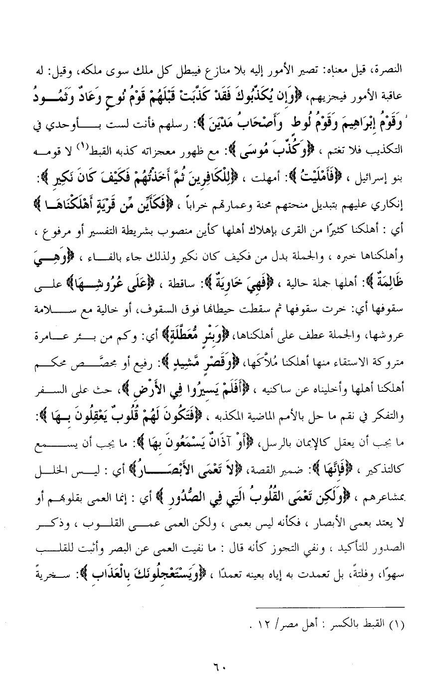 النصرة، قيل معناه: تصير الأمور إليه بلا منازع فيبطل كل ملك سوى ملكه، وقيل: له عاقبة الأمور فيجزيهم، (وَإِنْ يُكَذِّبُوكَ فَقَدْ كَذَّبَتْ قَبْلَهُمْ قَوْمُ نُوحٍ وَعَادٌ وَثَمُودُ وَقَوْمُ إِبْرَاهِيمَ وَقَوْمُ لُوطٍ وَأَصْحَابُ مَدْيَنَ): رسلهم فأنت لست بأوحدي في التكذيب فلا تغتم، (وَكُذِّبَ مُوسى): مع ظهور معجزاته كذبه القبط لا قومه بنو إسرائيل، (فَأَمْلَيْتُ): أمهلت، (لِلْكَافِرِينَ ثُمَّ أَخَذْتُهُمْ فَكَيْفَ كَانَ نَكِيرِ): إنكاري عليهم بتبديل منحتهم محنة وعمارتهم خرابًا، (فَكَأَيِّنْ مِنْ قَرْيَةٍ أَهْلَكْنَاهَا) أي: أهلكنا كثيرًا من القرى بإهلاك أهلها كأين منصوب بشريطة التفسير أو مرفوع، وأهلكناها خبره، والجملة بدل من فكيف كان نكير ولذلك جاء بالفاء، (وَهِيَ ظَالِمَةٌ): أهلها جملة حالية، (فَهِيَ خَاوِيَةٌ): ساقطة، (عَلَى عُرُوشِهَا) على سقوفها أي: خرت سقوفها ثم سقطت حيطانها فوق السقوف، أو خالية مع سلامة عروشها، والجملة عطف على أهلكناها، (وَبِئْرٍ مُعَطَّلَةٍ) أي: وكم من بئر عامرة متروكة الاستقاء منها أهلكنا مُلَّاكَها، (وَقَصْرٍ مَشِيدٍ): رفيع أو مجصَّص محكم أهلكنا أهلها وأخليناه عن ساكنيه، (أَفَلَمْ يَسيرُوا في الْأَرْضِ)، حثٌّ على السفر والتفكر في نقم ما حل بالأمم الماضية المكذبه، (قَتَكُونَ لَهُمْ قُلُوبٌ يَعْقِلُونَ بِهَا): ما يجب أن يعقل كالإيمان بالرسل، (أَوْ آذَانٌ يَسْمَعُونَ بِهَا): ما يجب أن يسمع كالتذكير، (فَإِنَّهَا) ضمير القصة، (لَا تَعْمَى الْأَبْصَارُ) أي: ليس الخلل بمشاعرهم، (وَلَكِنْ تَعْمَى الْقُلُوبُ الَّتِي فِي الصُّدُورِ) أي: إنما العمى بقلوبهم أو لا يعتد بعمى الأبصار، فكأنه ليس بعمى، ولكن العمى عمى القلوب، وذكر الصدور للتأكيد، ونفي التجوز كأنه قال: ما نفيت العمى عن البصر وأثبت للقلب سهوًا، وفلتةً، بل تعمدت به إياه بعينه تعمدًا، (وَيَسْتَعْجِلُونَكَ بِالْعَذَابِ): سخريةً