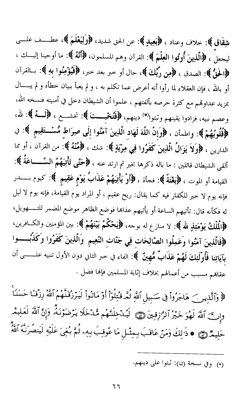شِقَاقٍ): خلاف وعناد، (بَعِيدٍ): عن الحق شديد (وَلِيَعْلَمَ)، عطف على ليجعل) (الذِينَ أُوتُوا العلمَ): القرآن وهم المسلمون، (أنَّه): ما أوحينا إليك، (الحَقُّ): الصدق، (مِن ربكَ) حال أو خبر بعد خبر، (فَيؤْمِنوا بِهِ): بالقرآن أو بالله، فإن العقلاء لما رأوا أنه أعرض عما تكلم به، ولم يعبأ ببيان خطأه ولم يبال بمزيد عداوتهم مع كثرة حرصه بألفتهم، علموا أن الشيطان دخل في أمنيته فنسخه الله، وعصم نبيه، فزادوا يقينهم وثبتوا دينهم، (فَتُخْبِتَ): تخشع، (لَه): لله، (قُلُوبُهُمْ): واطمأن، (وَإِنَّ اللهَ لَهَادِ الَّذِينَ آمَنُوا إِلَى صِرَاط مسْتَقِيمٍ): في الدارين، (وَلاَ يَزَالُ الذِينَ كَفَرُوا فِي مِريةٍ): شك، (مِّنه). من القرآن، أو مما ألقى الشيطان قائلين: ما باله ذكرها بخير ثم ارتد عنه، (حَتَّى تَأْتِيَهُم السَّاعَةُ): القيامة أو الموت، (بَغتةً): فجأة، (أَوْ يَأْتِيَهُمْ عَذَابُ يَوْمٍ عَقِيمٍ): كيوم بدر فإنه يوم لا خير للكفار فيه كما يقال: ريح عقيم، أو المراد يوم القيامة، فإنه يوم لا ليل له فكأنه قال: تأتيهم الساعة أو يأتيهم عذابها فوضع الظاهر موضع المضمر للتهويل، (الملْكُ يَوْمَئِذٍ لله): لا منازع له بوجه، (يَحْكمُ بَيْنَهمْ): بين المؤمنين والكافرين، (فَالَّذِينَ آمنوا وَعَمِلُوا الصَّالِحَات فِي جَنَّاتِ النَّعِيمِ وَالَّذِينَ كَفَرُوا وَكَذَّبُوا بِآيَاتِنَا فَأُولَئِكَ لَهُمْ عَذَابٌ مُهِينٌ): الفاء في خبر الثاني دون الأول تنبيه على أن عقابهم مسبب من أعمالهم بخلاف إثابة المسلمين فإنها فضل.