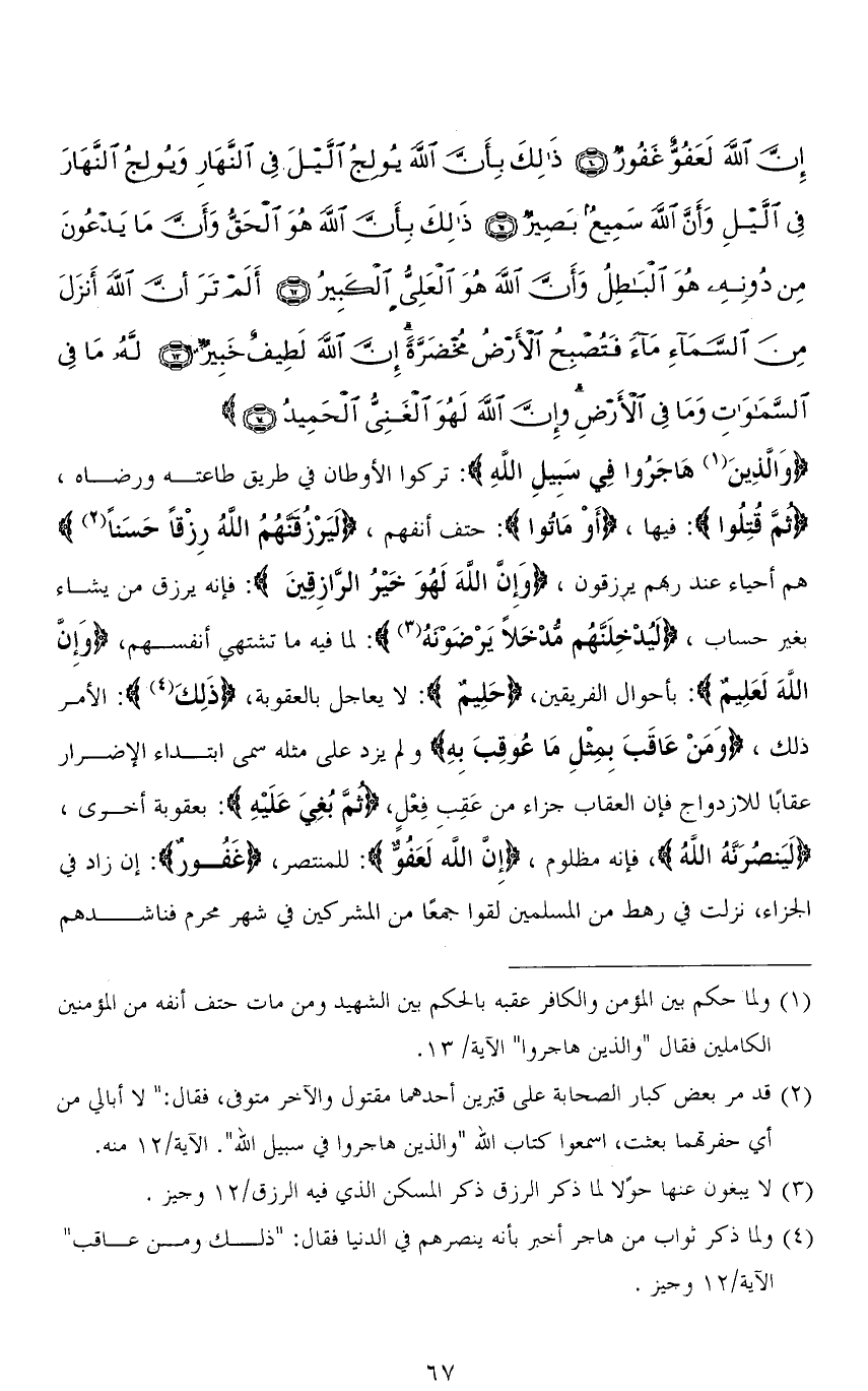 (وَالَّذِينَ هَاجَرُوا فِي سَبِيلِ اللهِ): تركوا الأوطان في طريق طاعته ورضاه، (ثُمَّ قُتِلُوا): فيها، (أَوْ مَاتُوا): حتف أنفهم، (لَيَرْزُقَنَّهُمُ اللهُ رِزْقًا حَسَنًا) هم أحياء عند ربّهم يرزقون، (وَإِنَّ اللهَ لَهُوَ خيْرُ الرازقِينَ): فإنه يرزق من يشاء بغير حساب، (لَيُدْخِلَنَّهُمْ مُدْخَلًا يَرْضَوْنَهُ): لما فيه ما تشتهي أنفسهم، (وَإِنَّ اللهَ لَعَلِيمٌ): بأحوال الفريقين، (حَلِيمٌ): لا يعاجل بالعقوبة، (ذلِكَ): الأمر ذلك، (وَمَنْ عَاقَبَ بِمِثْلِ مَا عُوقِبَ بِهِ) ولم يزد على مثله سمي ابتداء الإضرار عقابًا للازدواج فإن العقاب جزاء من عَقِبِ فِعْلٍ، (ثُمَّ بُغِيَ عَلَيْهِ): بعقوبة أخرى، (لَيَنْصُرَنَّهُ اللهُ)، فإنه مظلوم، (إِنَّ اللهَ لَعَفُوٌّ): للمنتصر، (غَفُورٌ): إن زاد في الجزاء، نزلت في رهط من المسلمين لقوا جمعًا من المشركين في شهر محرم فناشدهم