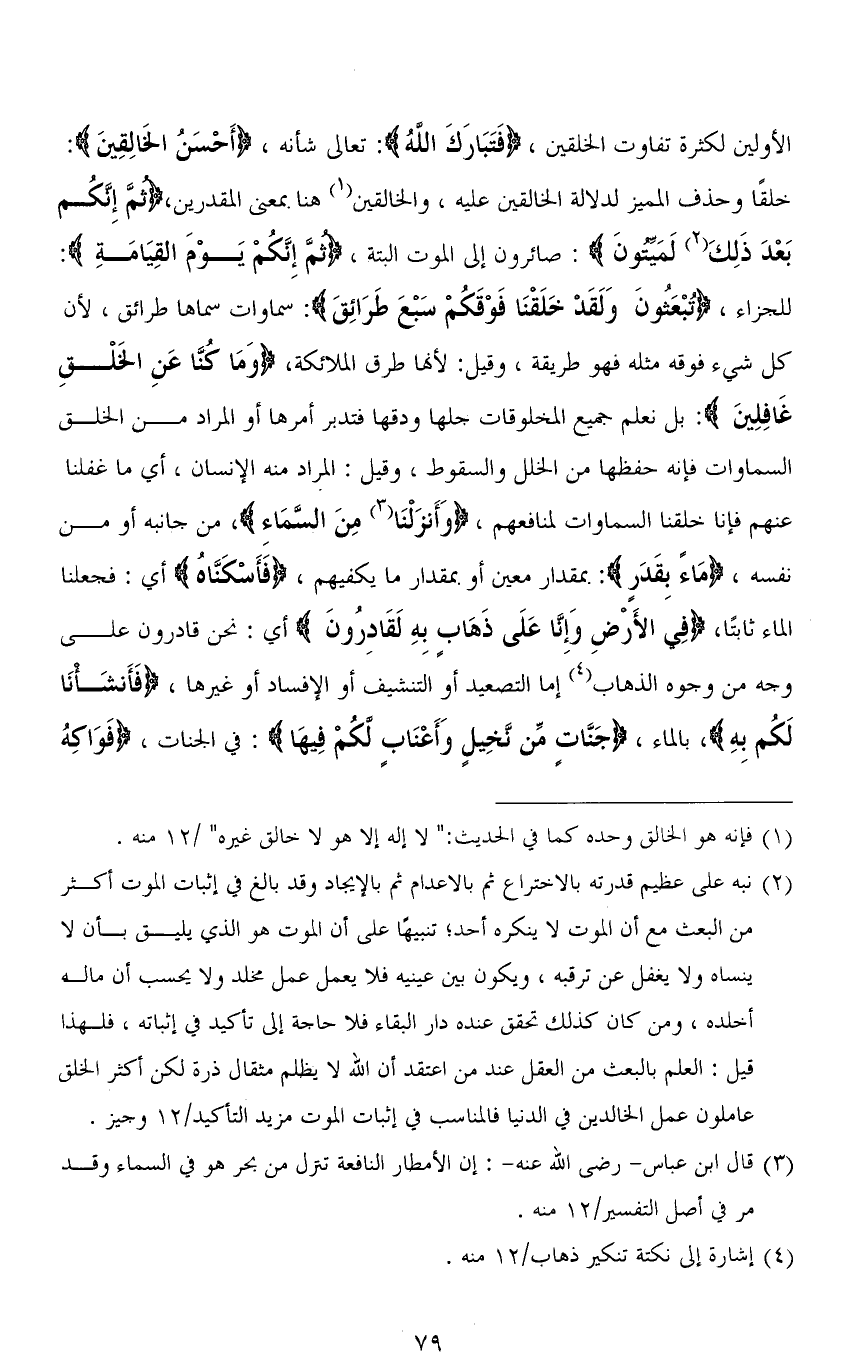 الأولين لكثرة تفاوت الخلقين، (فَتَبَارَكَ اللهُ): تعالى شأنه، (أَحْسَنُ الْخَالِقِينَ): خلقًا وحذف المميز لدلالة الخالقين عليه، والخالقين هنا بمعنى المقدرين، (ثُمَّ إِنَّكُمْ بَعْدَ ذَلِكَ لَمَيِّتُونَ): صائرون إلى الموت ألبتَّة، (ثُمَّ إِنَّكُمْ يَوْمَ الْقِيَامَةِ): للجزاء، (تُبْعَثُونَ وَلَقَدْ خَلَقْنَا فَوْقَكُمْ سَبْعَ طَرَائِقَ): سماوات سماها طرائق، لأن كل شيء فوقه مثله فهو طريقة، وقيل: لأنها طرق الملائكة، (وَمَا كنَّا عَنِ الخَلْقِ غافِلينَ): بل نعلم جميع المخلوقات جلها ودقها فتدبر أمرها أو المراد من الخلق السماوات فإنه حفظها من الخلل والسقوط، وقيل: المراد منه الإنسان، أي ما غفلنا عنهم فإنا خلقنا السماوات لمنافعهم، (وَأَنزَلْنَا مِنَ السَّمَاءِ)، من جانبه أو من نفسه، (مَاءً بِقَدَر): بمقدار معين أو بمقدار ما يكفيهم، (فأَسْكَنَّاهُ) أي: فجعلنا الماء ثابتًا، (فِي الأَرْضِ وَإِنَّا عَلَى ذَهَابٍ بِهِ لَقَادِرُونَ) أي: نحن قادرون على وجه من وجوه الذهاب إما التصعيد أو التنشيف أو الإفساد أو غيرها، (فَأَنْشَأْنَا لَكُمْ بِهِ)، بالماء، (جَنَّاتٍ مِنْ نَخِيلٍ وَأَعْنَابٍ لَكُمْ فِيهَا): في الجنات، (فَوَاكِهُ