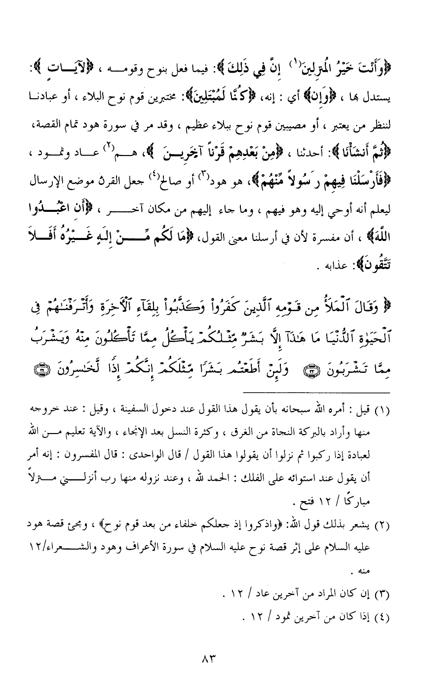 (وَأَنْتَ خَيْرُ الْمُنْزِلِينَ إِن فِي ذَلِكَ): فيما فعل بنوح وقومه، (لَآيَاتٍ): يستدل بها، (وَإِنْ) أي: إنه، (كُنَّا لَمُبْتَلِينَ): مختبرين قوم نوح بالبلاء، أو عبادنا لننظر من يعتبر، أو مصيبين قوم نوح ببلاء عظيم، وقد مر في سورة هود تمام القصة، (ثُمَّ أَنْشَأْنَا): أحدثنا، (مِنْ بَعْدِهِمْ قَرْنًا آخَرِينَ)، هم عاد وثمود، (فَأَرْسَلْنَا فِيهِمْ رَسُولاً مِّنْهُمْ)، هو هود أو صالح جعل القرن موضع الإرسال ليعلم أنه أوحى إليه وهو فيهم، وما جاء إليهم من مكان آخر، (أَنِ اعْبُدُوا اللهَ)، أن مفسرة لأن في أرسلنا معنى القول، (مَا لَكُمْ مِنْ إِلَهٍ غَيْرُهُ أَفَلَا تَتَّقُونَ): عذابه.