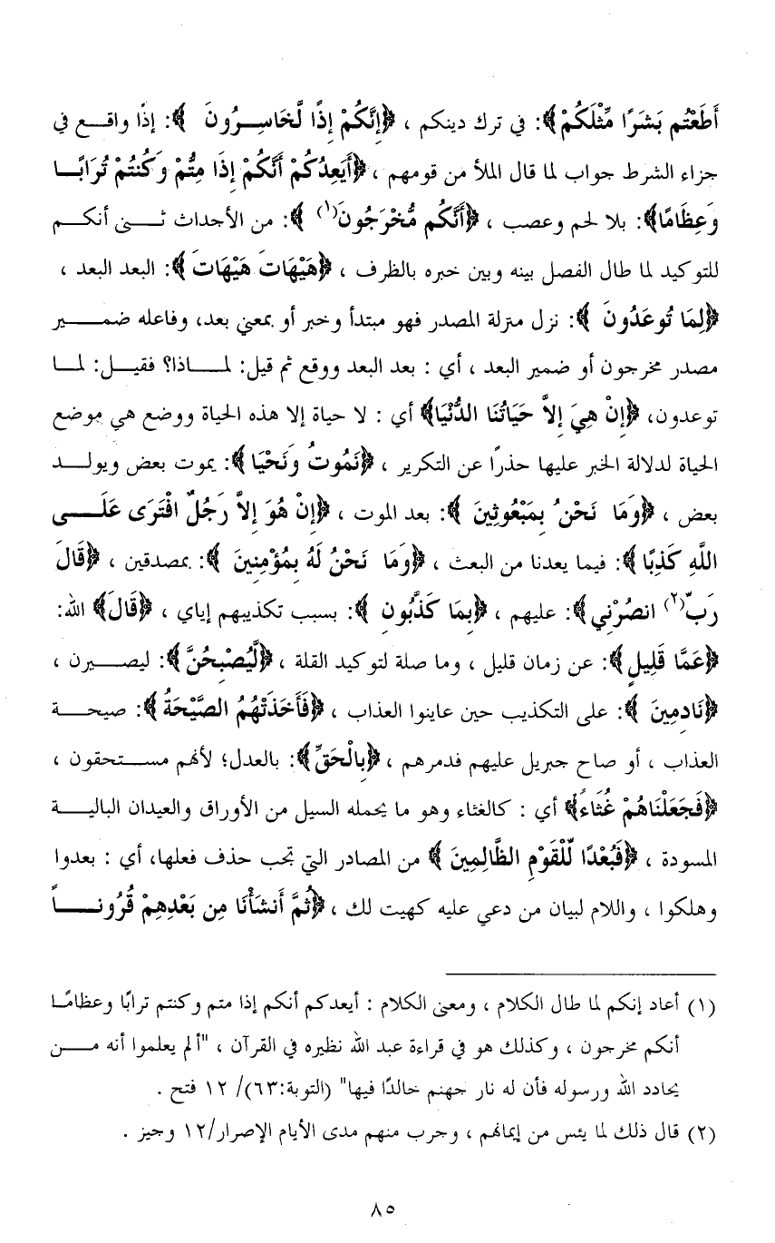 أَطَعتم بَشَرًا مثلَكُمْ): في ترك دينكم، (إِنَّكُمْ إِذًا لَخَاسِرُونَ): إذًا واقع في جزاء الشرط جواب لما قال الملأ من قومهم، (أَيَعِدُكُمْ أَنَّكُمْ إِذَا مِتُّمْ وَكُنْتُمْ تُرَابًا وَعِظَامًا): بلا لحم وعصب، (أَنَّكُمْ مُخْرَجُونَ): من الأجداث ثنى أنَّكُمْ للتوكيد لما طال الفصل بينه وبين خبره بالظرف، (هَيْهَاتَ هَيْهَاتَ): البعد البعد، (لِمَا تُوعَدُون): نزل منزلة المصدر فهو مبتدأ وخبر أو بمعنى بعد، وفاعله ضمير مصدر مخرجون أو ضمير البعد، أي: بعد البعد ووقع ثم قيل: لماذا؟ فقيل: لما توعدون، (إِنْ هِيَ إِلَّا حَيَاتُنَا الدُّنْيَا) أي: لا حياة إلا هذه الحياة ووضع هي موضع الحياة لدلالة الخبر عليها حذرًا عن التكرير، (نَمُوتُ وَنَحْيَا): يموت بعض ويولد بعض، (وَمَا نَحْنُ بِمَبْعُوثِينَ): بعد الموت، (إِنْ هُوَ إِلا رَجُلٌ افْتَرَى عَلَى اللهِ كَذِبًا): فيما يعدنا من البعث، (وَمَا نَحْنُ لَهُ بِمُؤْمِنِينَ): بمصدقين، (قَالَ رَبِّ انصُرْنِي): عليهم، (بِمَا كَذبُون): بسبب تكذيبهم إياي، (قَالَ) الله: (عَمَّا قَلِيلٍ): عن زمان قليل، وما صلة لتوكيد القلة، (لَّيصْبِحُنَّ): ليصيرن، (نَادِمِينَ): على التكذيب حين عاينوا العذاب، (فَأَخَذَتْهُمُ الصَّيْحَةُ): صيحة العذاب، أو صاح جبريل عليهم فدمرهم، (بِالْحَقِّ): بالعدل؛ لأنَّهُم مستحقون، (فَجَعَلْنَاهُمْ غُثَاءً) أي: كالغثاء وهو ما يحمله السيل من الأوراق والعيدان البالية المسودة، (فَبُعْدًا لِلْقَوْمِ الظَّالِمِينَ) من المصادر التي تجب حذف فعلها، أي: بعدوا وهلكوا، واللام لبيان من دعي عليه كهيت لك، (ثُمَّ أَنْشَأْنَا مِنْ بَعْدِهِمْ قُرُونًا