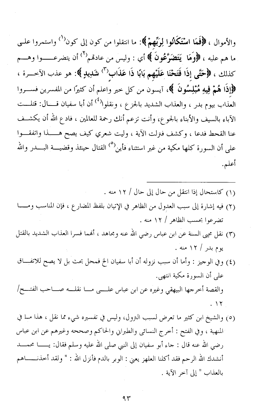 والأموال، (فَمَا اسْتَكَانُوا لِرَبِّهِمْ): ما انتقلوا من كون إلى كون واستمروا على ما هم عليه، (وَمَا يَتَضَرَّعُونَ) أي: وليس من عادتهم أن يتضرعوا وهم كذلك، (حَتى إِذَا فَتَحْنَا عَلَيْهِم بَابًا ذَا عَذَابٍ شَدِيدٍ): هو عذب الآخرة، (إِذا هُمْ فيهِ مُبْلِسُون)، آيسون من كل خير واعلم أن كثيرًا من المفسرين فسروا العذاب بيوم بدر، والعذاب الشديد بالجزع، ونقلوا أن أبا سفيان قال: قتلت الآباء بالسيف والأبناء بالجوع، وأنت تزعم أنك رحمة للعالمين، فادع الله أن يكشف عنا القحط فدعا، وكشف فنزلت الآية، وليت شعري كيف يصح هذا واتفقوا على أن السورة كلها مكية من غير استثناء فأين القتال حينئذ وقضية [بدر] والله أعلم.
