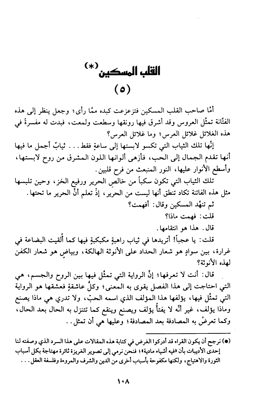 قلت: يا عجبًا! أتريدها في ثياب راهبة مكبكبة فيها كما ألقيت البضاعة في غرارة، بين سواد هو شعار الحداد على الأنوثة الهالكة، وبياض هو شعار الكفن لهذه الأنوثة؟