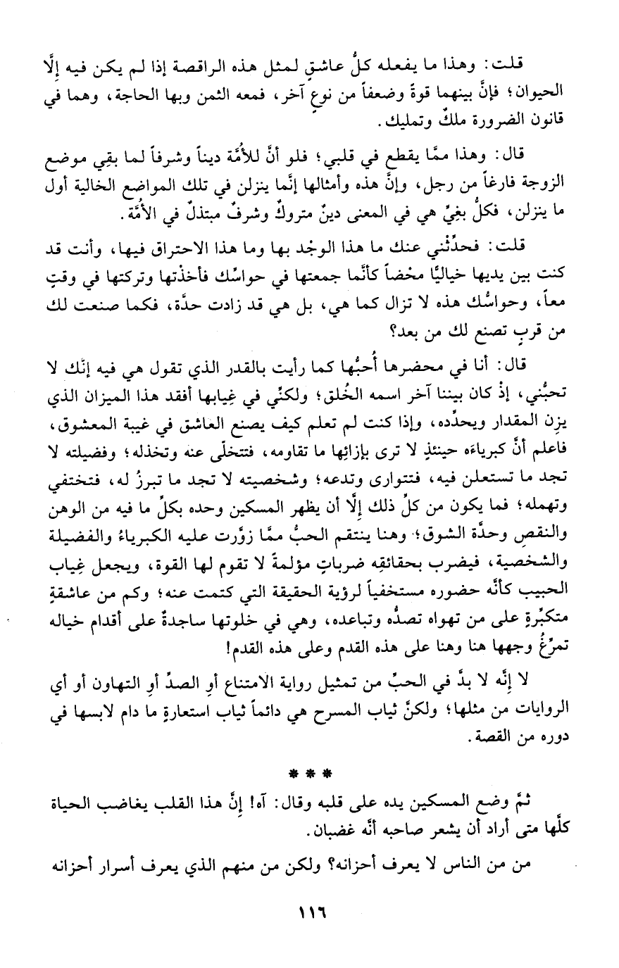لا إنه لا بد في الحب من تمثيل رواية الامتناع أو الصد أو التهاون أو أي الروايات من مثلها؛ ولكن ثياب المسرح هي دائمًا ثياب استعارة ما دام لابسها في دوره من القصة.