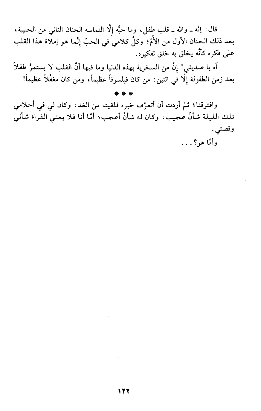 قال: إنه -والله- قلب طفل، وما حبه إلا التماسه الحنان الثاني من الحبيبة، بعد ذلك الحنان الأول من الأم؛ وكل كلامي في الحب إنما هو إملاء هذا القلب على فكره كأنه يخلق به خلق تفكيره.
