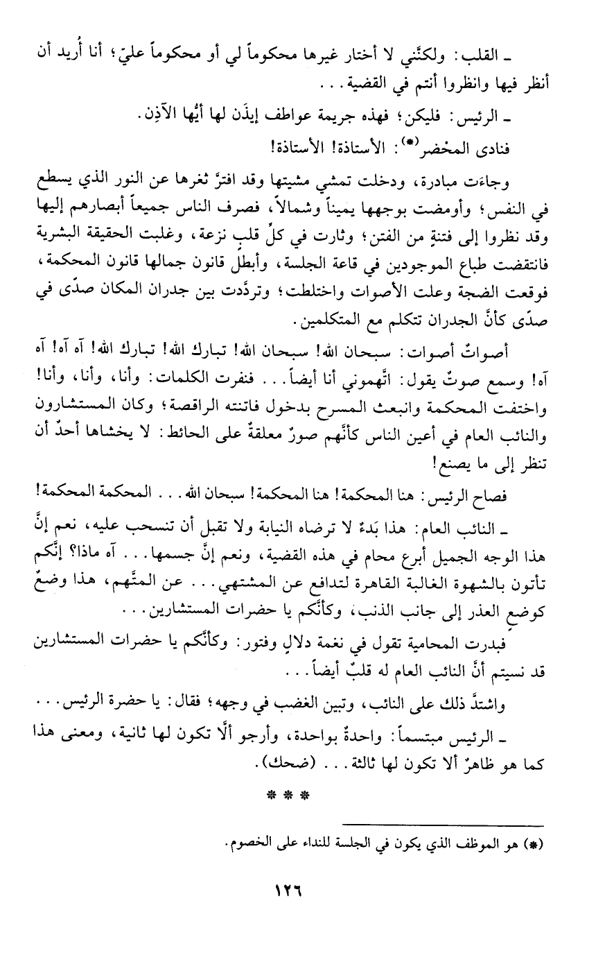 فبدرت المحامية تقول في نغمة دلال وفتور: وكأنكم يا حضرات المستشارين قد نسيتم أن النائب العام له قلب أيضًا ...