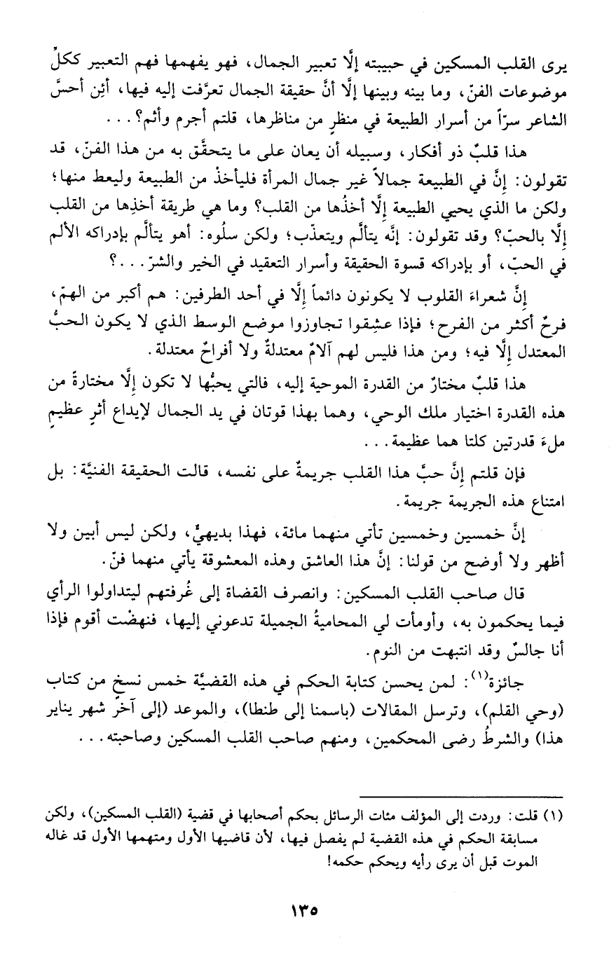 1 قلت: وردت إلى المؤلف مئات الرسائل بحكم أصحابها في قضية "القلب المسكين"، ولكن مسابقة الحكم في هذه القضية لم يفصل فيها؛ لأن قاضيها الأول ومتهمها الأول قد غاله الموت قبل أن يرى رأيه ويحكم حكمه!