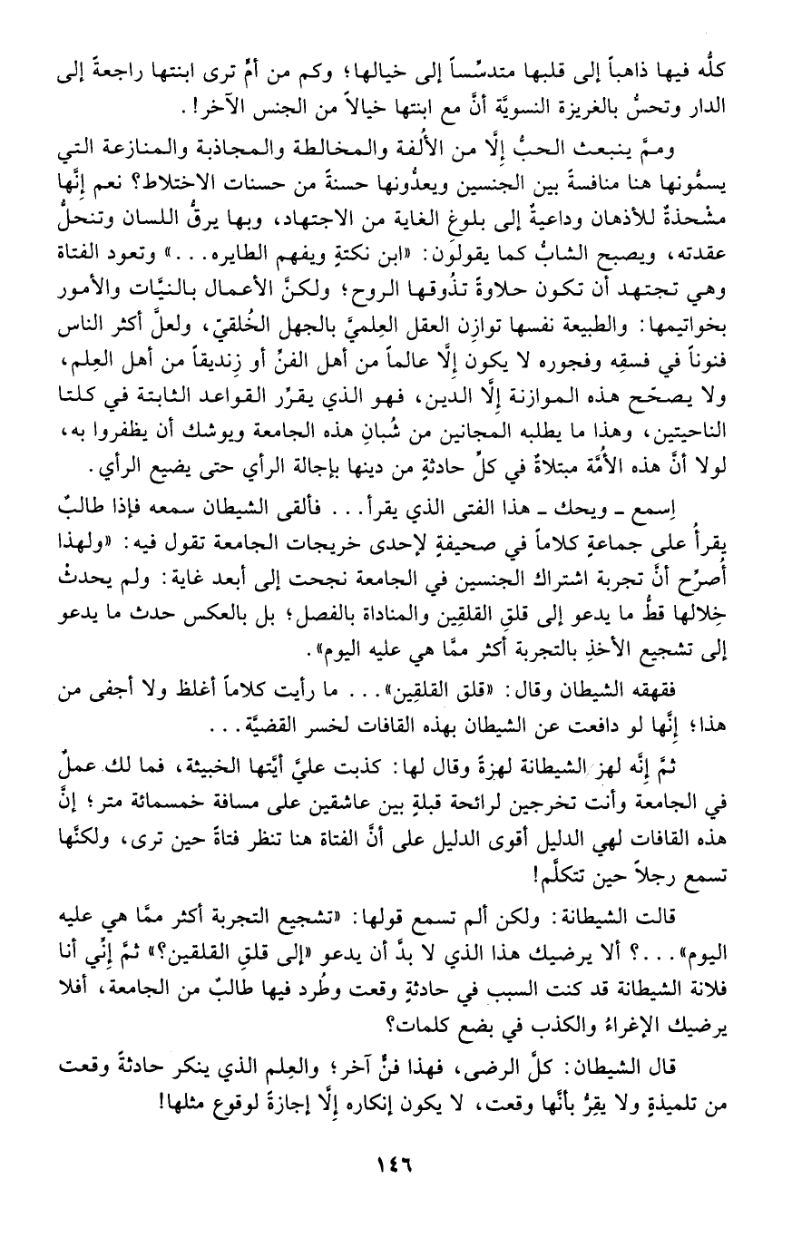 قالت الشيطانة: ولكن ألم تسمع قولها: "تشجيع التجربة أكثر مما هي عليه اليوم"..؟ ألا يرضيك هذا الذي لا بد أن يدعو "إلى قلق القلقين؟ " ثم إني أنا فلانة الشيطانة قد كنت السبب في حادثة وقعت وطر فيها طالب من الجامعة، أفلا يرضيك الإغراء والكذب في بضع كلمات؟