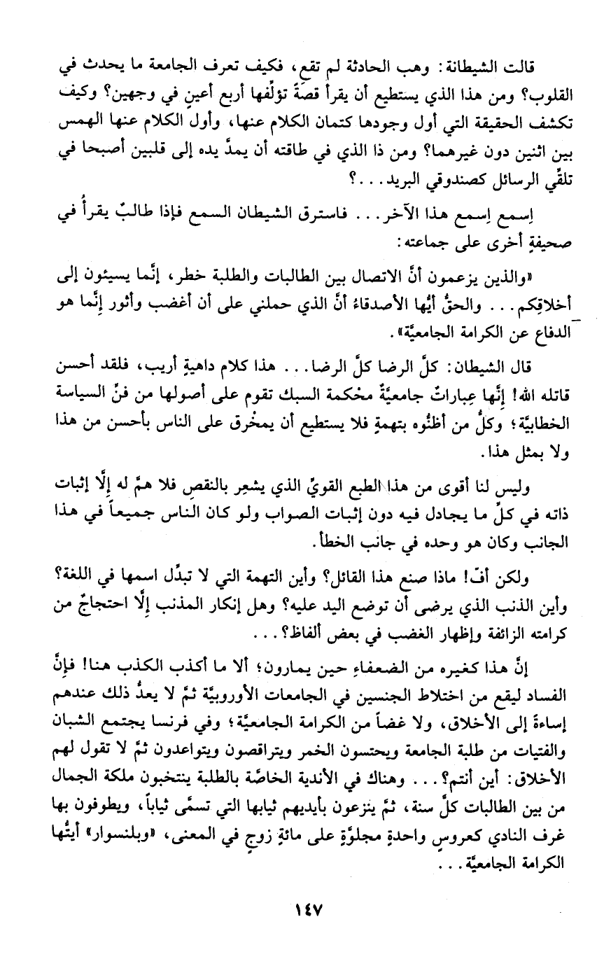 قالت الشيطانة: وهب الحادثة لم تقع، فكيف تعرف الجامعة ما يحدث في القلوب؟ ومن هذا الذي يستطيع أن يقرأ قصة تؤلفها أربع أعين في وجهين؟ وكيف تكشف الحقيقة التي أول وجودها كتمان الكلام عنها، وأول الكلام عنها الهمس بين اثنين دون غيرهما؟ ومن ذا الذي طاقته أن يمد بيده إلى قلبين في تلقي الرسائل كصندوقي البريد..؟