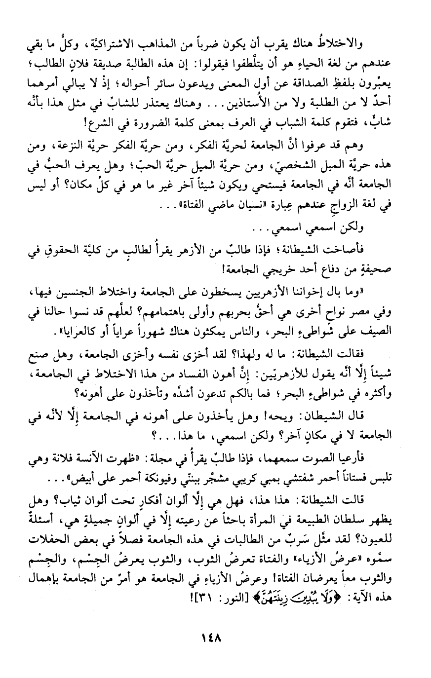 فقالت الشيطانة: ما له ولهذا؟ لقد أخزى نفسه وأخزى الجامعة، وهل صنع شيئًا إلا أنه يقول للأزهريين: إن أهون الفساد من هذا الاختلاط في الجامعة، وأكثره في شواطئ البحر؛ فما بالكم تدعون أشده وتأخذون على أهونه؟