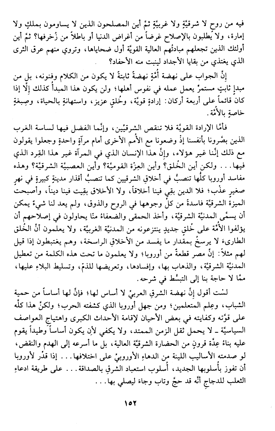 فأما الإرادة القوية فلا تنقص الشرقيين، وإنما الفضل فيها لساسة الغرب الذين بصرونا بأنفسنا إذ وضعونا مع الأمم الأخرى أمام مرآة واحدة وجعلوا يقولون مع ذلك إننا غير هؤلاء، وإن هذا الإنسان الذي في المرأة غير هذا الفرد الذي فيها ... ولكن أين الخلق؟ وأين العزة القومية؟ وأين العصبية الشرقية؟ وهذه مفاسد أوربا كلها تنصب في أخلاق الشرقيين كما تنصب أقذار مدينة كبيرة في نهر صغير عذب؛ فلا الدين بقي فينا أخلاقًا، ولا الأخلاق بقيت فينا دينًا، وأصبحت الميزة الشرقية فاسدة من كل وجوهها في الروح والذوق، ولم يعد لنا شيء يمكن أن يسمي المدنية الشرقية، وأخذ الحمقى والضعفاء منا يحاولون في إصلاحهم أن يؤلفوا الأمة على خلق جديد ينتزعونه من المدنية الغربية، ولا يعلمون أن الخلق الطارئ لا يرسخ بمقدار ما يفسد من الأخلاق الراسخة، وهم يغتبطون إذا قيل لهم مثلًا: إن مصر قطعة من أوربا؛ ولا يعلمون ما تحت هذه الكلمة من تعطيل المدنية الشرقية، والذهاب بها، وإفسادها، وتعريضها للذم، وتسليط البلاد عليها، مما لا حاجة بنا إلى التبسط في شرحه.