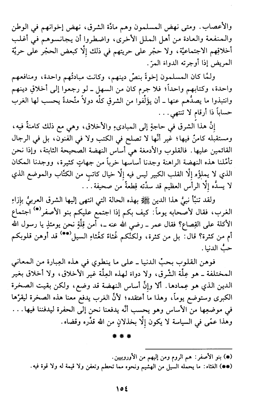 ولقد تنبأ نبي هذا الدين صلى الله عليه وسلم بهذه الحالة التي انتهى إليها الشرق العربي بإزاء الغرب، فقال لأصحابه يومًا: كيف بكم إذا اجتمع عليكم بنو الأصفر* اجتماع الأكلة على القصاع؟ فقال عمر رضي الله عنه: أمن قلة نحن يومئذ يا رسول الله أم من كثرة؟ قال: بل من كثرة، ولكنكم غثاء كغثاء السيل** قد أوهن قلوبكم حب الدنيا.