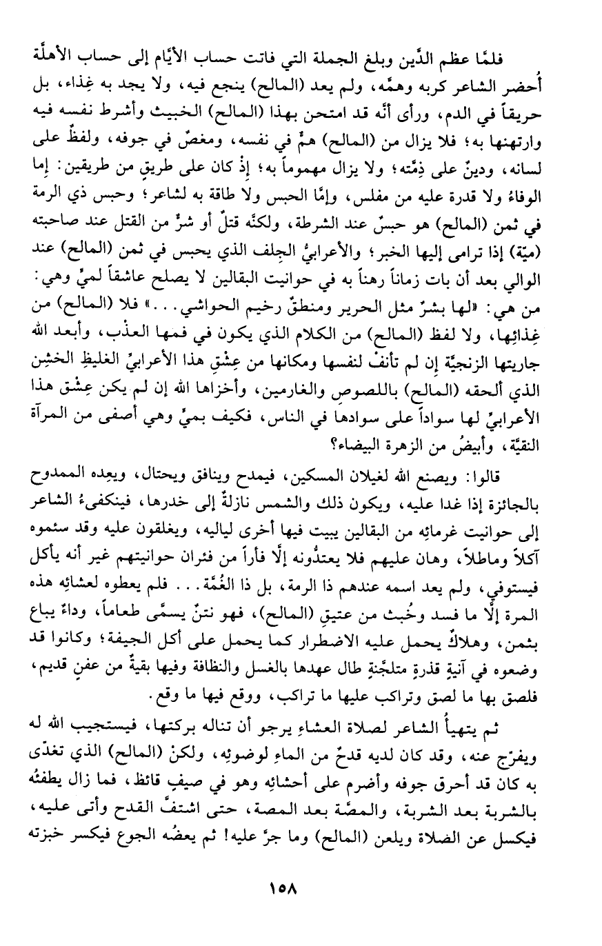 فلما عظم الدين وبلغ الجملة التي فاتت حساب الأيام إلى حساب الأهلة أحضر الشاعر كربه وهمه، ولم يعد "المالح" ينجع فيه، ولا يجد به غذاء، بل حريقًا في الدم، ورأى أنه قد امتحن بهذا "المالح" الخبيث وأشرط نفسه فيه وارتهنها به؛ فلا يزال من "المالح" هم في نفسه، ومغص في جوفه، ولفظ على لسانه، ودين على ذمته؛ ولا يزال مهمومًا به؛ إذ كان على طريق من طريقين: إما الوفاء ولا قدرة عليه من مفلس، وإما الحبس ولا طاقة به لشاعر؛ وحبس ذي الرمة في ثمن "المالح" هو حبس عند الشرطة، ولكنه قتل أو شر من القتل عند صاحبته "مية" إذا ترامى إليها الخبر؛ والأعرابي الجلف الذي يحبس في ثمن "المالح" عند الوالي بعد أن بات زمانًا رهنًا به في حوانيت البقالين لا يصلح عاشقًا لمي وهي: من هي: "لها بشر مثل الحرير ومنطق رخيم الحواشي.." فلا "المالح" من غذائها، ولا لفظ "المالح" من الكلام الذي يكون في فمها العذب، وأبعد الله جاريتها الزنجية إن لم تأنف لنفسها ومكانها من عشق هذا الأعرابي الغليظ الخشن الذي ألحقه "المالح" باللصوص والغارمين، وأخزاها الله إن لم يكن عشق هذا الأعرابي لها سوادًا على سوادها في الناس، فكيف بمي وهي أصفى من المرأة النقية، وأبيض من الزهرة البيضاء؟
