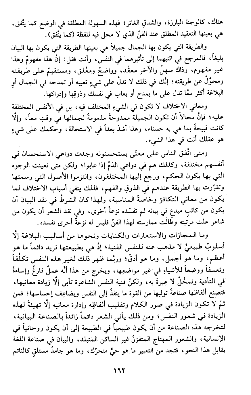 والطريقة التي يكون بها الجمال جميلًا هي بعينها الطريقة التي يكون بها البيان بليغًا، فالمرجع في اثنيهما إلى تأثيرهما في النفس، وأنت فقل: إن هذا مفهوم وهذا غير مفهوم، وذاك سهل والآخر معقد، وواضح ومغلق، ومستقيم على طريقته ومحول عن طريقته؛ إنك في ذلك لا تدل على شيء تعيبه أو تمدحه في الجمال أو البلاغة أكثر مما تدل على ما يمدح أو يعاب في نفسك وذوقها وإدراكها.