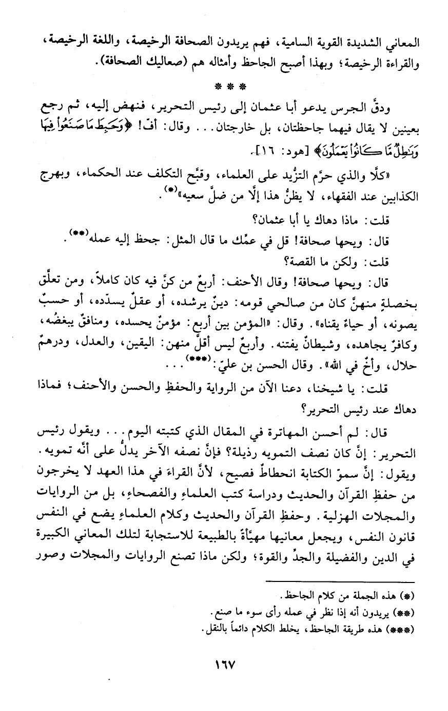 المعاني الشديدة القوية السامية، فهم يريدون الصحافة الرخيصة، واللغة الرخيصة، والقراءة الرخيصة؛ وبهذا أصبح الجاحظ وأمثاله هم "صعاليك الصحافة".