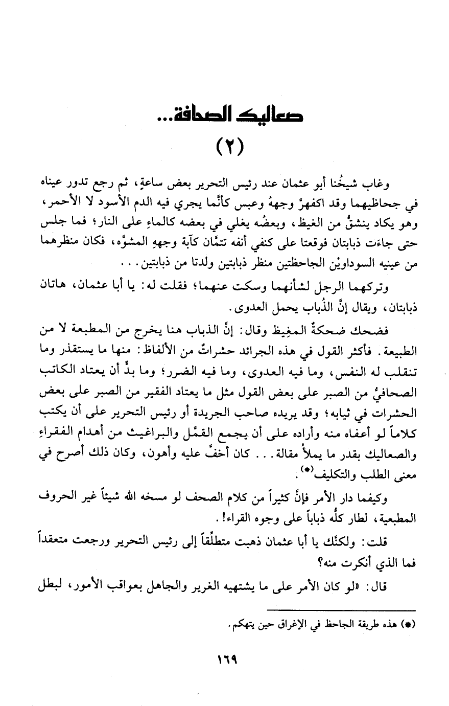 فضحك ضحكة المغيظ وقال: إن الذباب هنا يخرج من المطبعة لا من الطبيعة، فأكثر القول في هذه الجرائد حشرات من الألفاظ: منها ما يستقذر وما تنقلب له النفس، وما فيه العدوى، وما فيه الضرر؛ وما بد أن يعتاد الكاتب الصحافي من الصبر على بعض القول مثل ما يعتاد الفقير من الصبر على بعض الحشرات في ثيابه، وقد يريده صاحب الجريدة أو رئيس التحرير على أن يكتب كلامًا لو أعفاه منه وأراده على أن يجمع القمل والبراغيث من أهدام الفقراء والصعاليك بقدر ما يملأ مقالة.. كان أخف عليه وأهون، وكان ذلك أصرح من معنى الطلب والتكليف*.