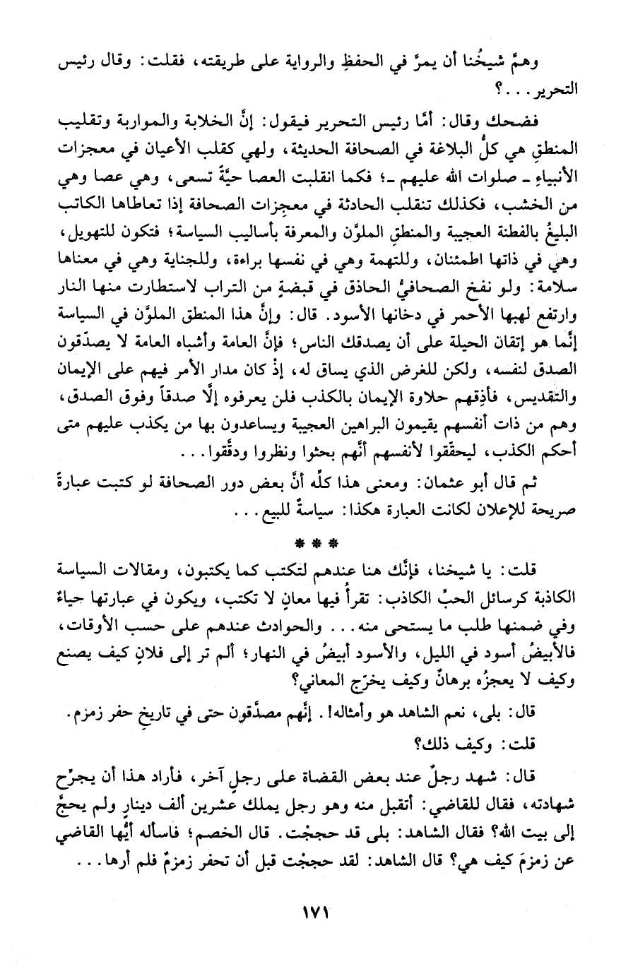 قلت: يا شيخنا، فإنك هنا عندهم؛ لتكتب كما يكتبون، ومقالات السياسة الكاذبة كرسائل الحب الكاذب: تُقرأ فيها معانٍ لا تكتب، ويكون في عبارتها حياة وفي ضمنها طلب ما يستحي منه ... والحوادث عندهم على حسب الأوقات، فالأبيض أسود في الليل، والأسود أبيض في النهار؛ ألم تر إلى فلان كيف يصنع وكيف لا يعجزه برهان وكيف يخرج المعاني؟