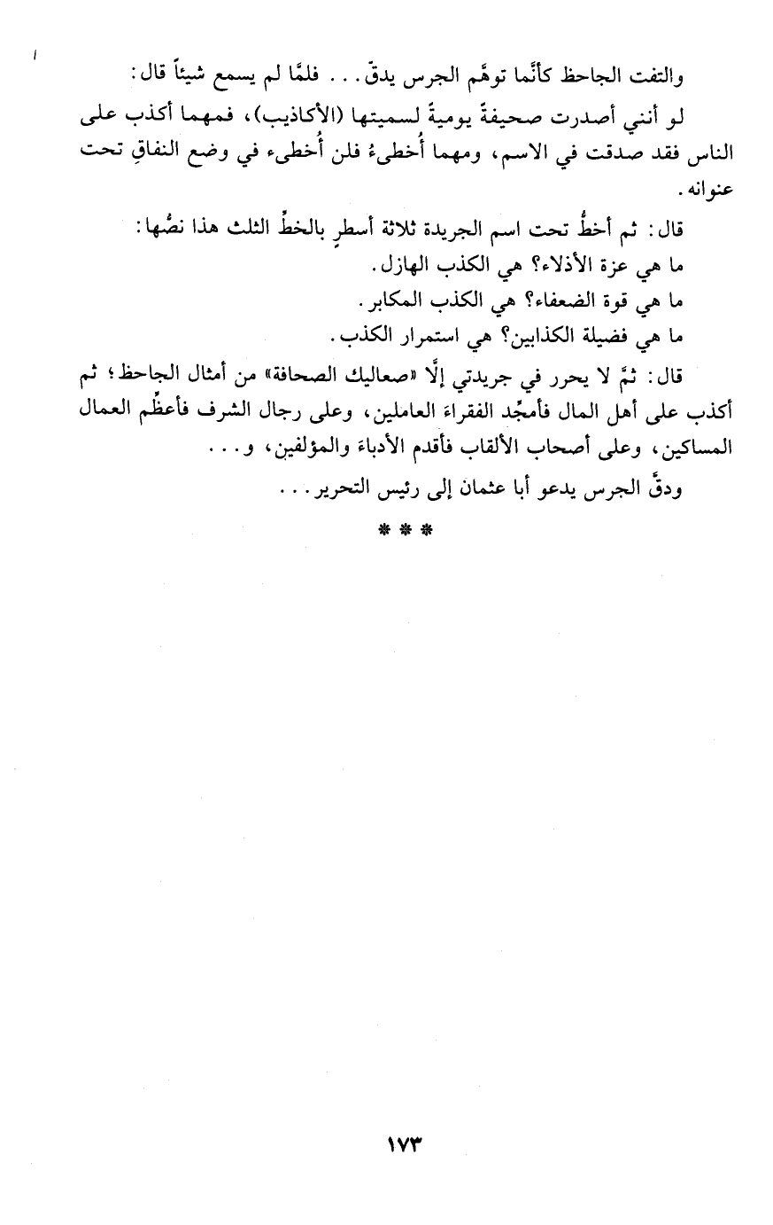 قال: ثم لا يحرر في جريدتي إلا "صعاليك الصحافة" من أمثال الجاحظ؛ ثم أكذب على أهل المال فأمجد الفقراء العاملين، وعلى رجال الشرف فأعظم العمال المساكين، وعلى أصحاب الألقاب فأقدم الأدباء والمؤلفين، و ...