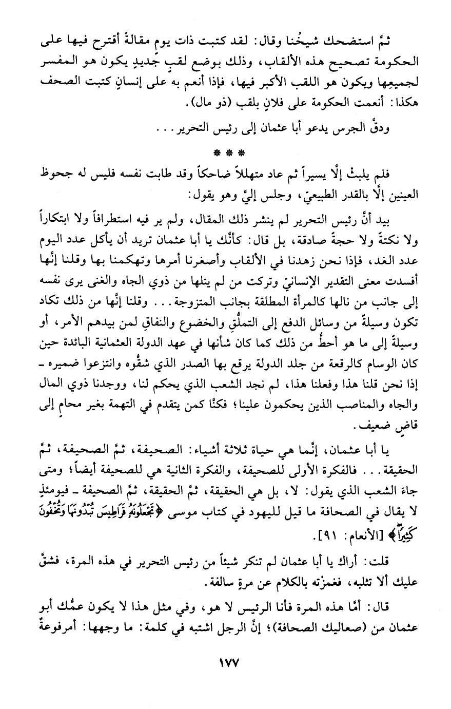 يا أبا عثمان، إنما هي حياة ثلاثة أشياء: الصحيفة، ثم الصحيفة، ثم الحقيقة.. فالفكرة الأولى للصحيفة، والفكرة الثانية هي للصحيفة أيضًا؛ ومتى جاء الشعب الذي يقول: لا، بل هي الحقيقة، ثم الحقيقة، ثم الصحيفة -فيومئذ لا يقال في الصحافة ما قيل لليهود في كتاب موسى: {تَجْعَلُونَهُ قَرَاطِيسَ تُبْدُونَهَا وَتُخْفُونَ كَثِيرًا} [الأنعام: 91] .