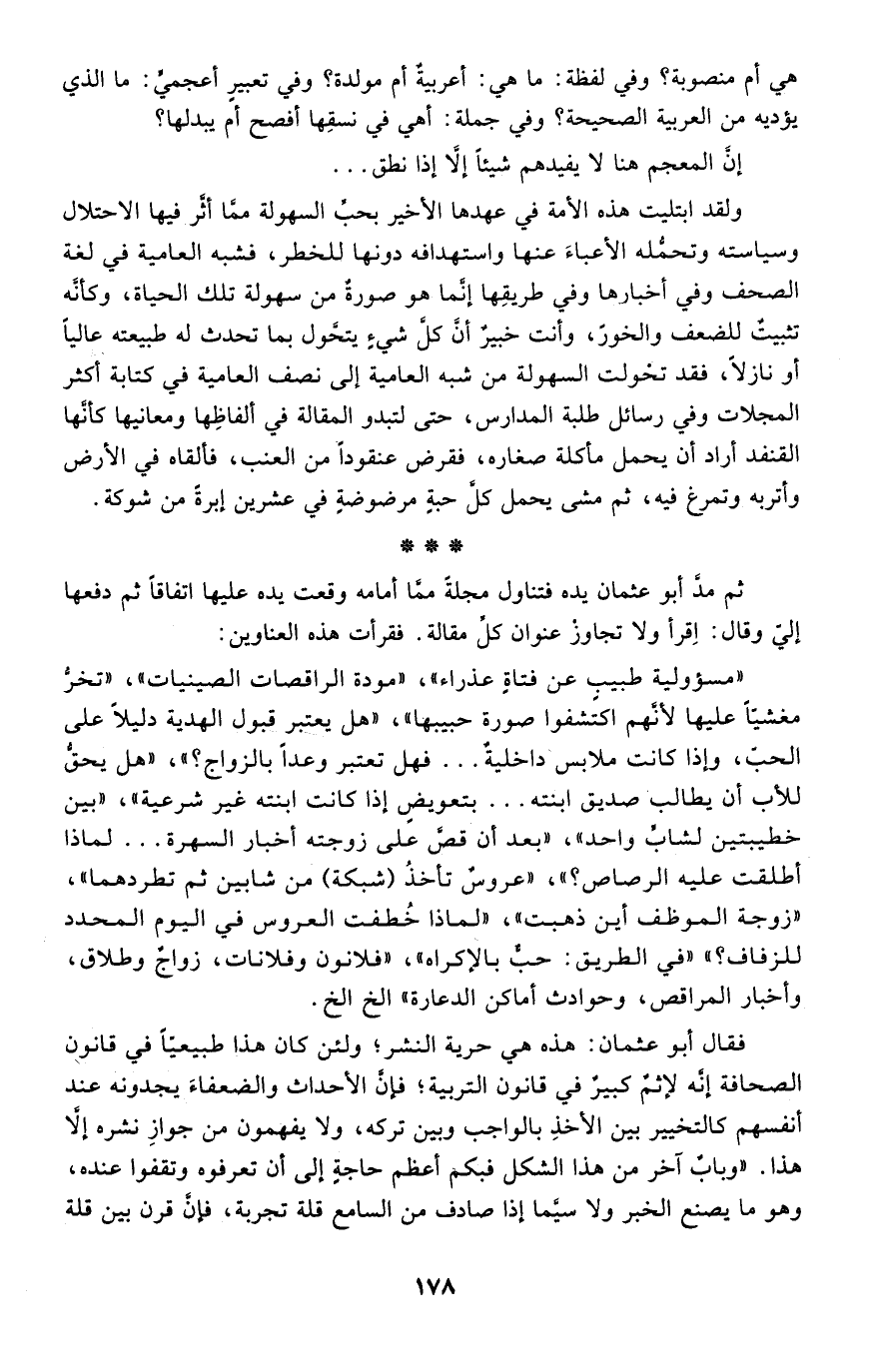 ثم مد أبو عثمان يده فتناول مجلة مما أمامه وقعت يده عليها اتفاقًا ثم دفعها إلي وقال: اقرأ ولا تجاوز عنوان كل مقالة. فقرأت هذه العناوين.