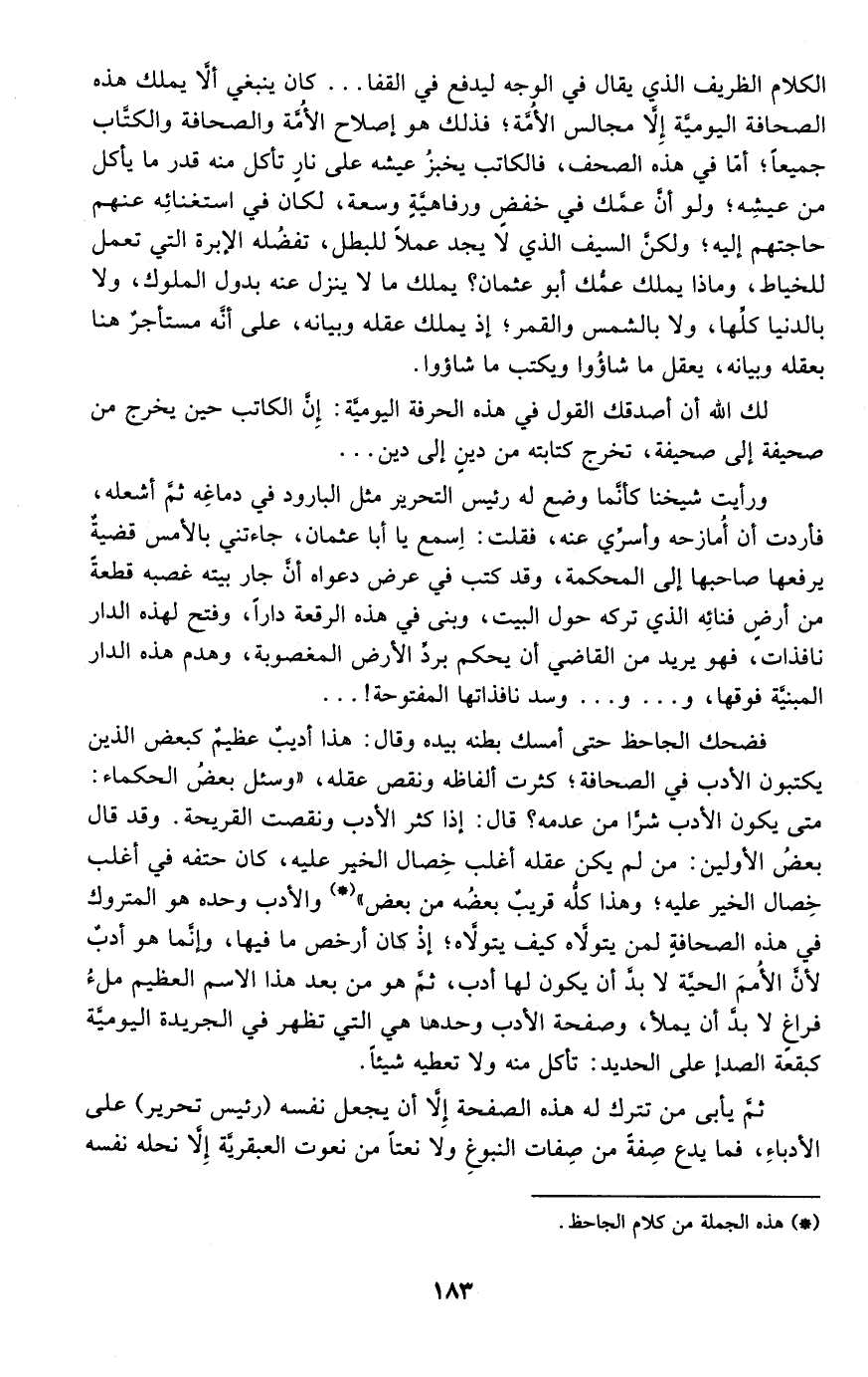 الكلام الظريف الذي يقال في الوجه ليدفع في القفا ... كان ينبغي ألا يملك هذه الصحافة اليومية إلا مجالس الأمة؛ فذلك هو إصلاح الأمة والصحافة والكتاب جميعًا؛ أما في هذه الصحف، فالكاتب يخبز عيشه على نار تأكل منه قدر ما يأكل من عيشه؛ ولو أن عمك في خفض ورفاهية وسعة، لكان في استغنائه عنهم حاجتهم إليه؛ ولكن السيف الذي لا يجد عملًا للبطل، تفضله الإبرة التي تعمل للخياط، وماذا يملك عمك أبو عثمان؟ يملك ما لا ينزل عنه بدون الملوك، ولا بالدنيا كلها، ولا بالشمس والقمر؛ إذ يملك عقله وبيانه، على أنه مستأجر هنا بعقله وبيانه، ويعقل ما شاءوا ويكتب ما شاءوا.