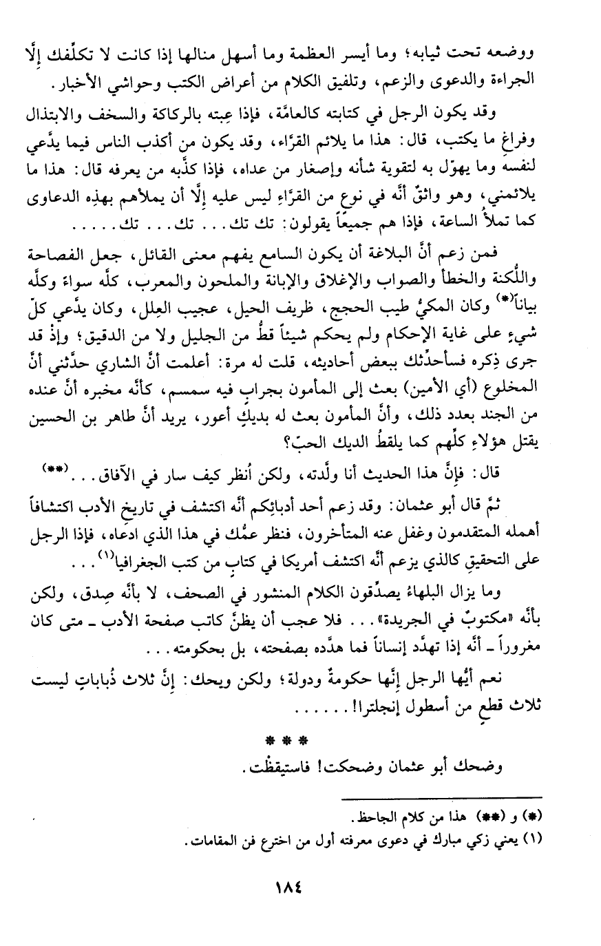 ثم قال أبو عثمان: وقد زعم أحد أدبائكم أنه اكتشف في تاريخ الأدب اكتشافًا أهمله المتقدمون وغفل عنه المتأخرون، فنظر عمك في هذا الذي ادعاه، فإذا الرجل على التحقيق كالذي يزعم أنه اكتشف أمريكا في كتاب من كتب الجغرافيا ...