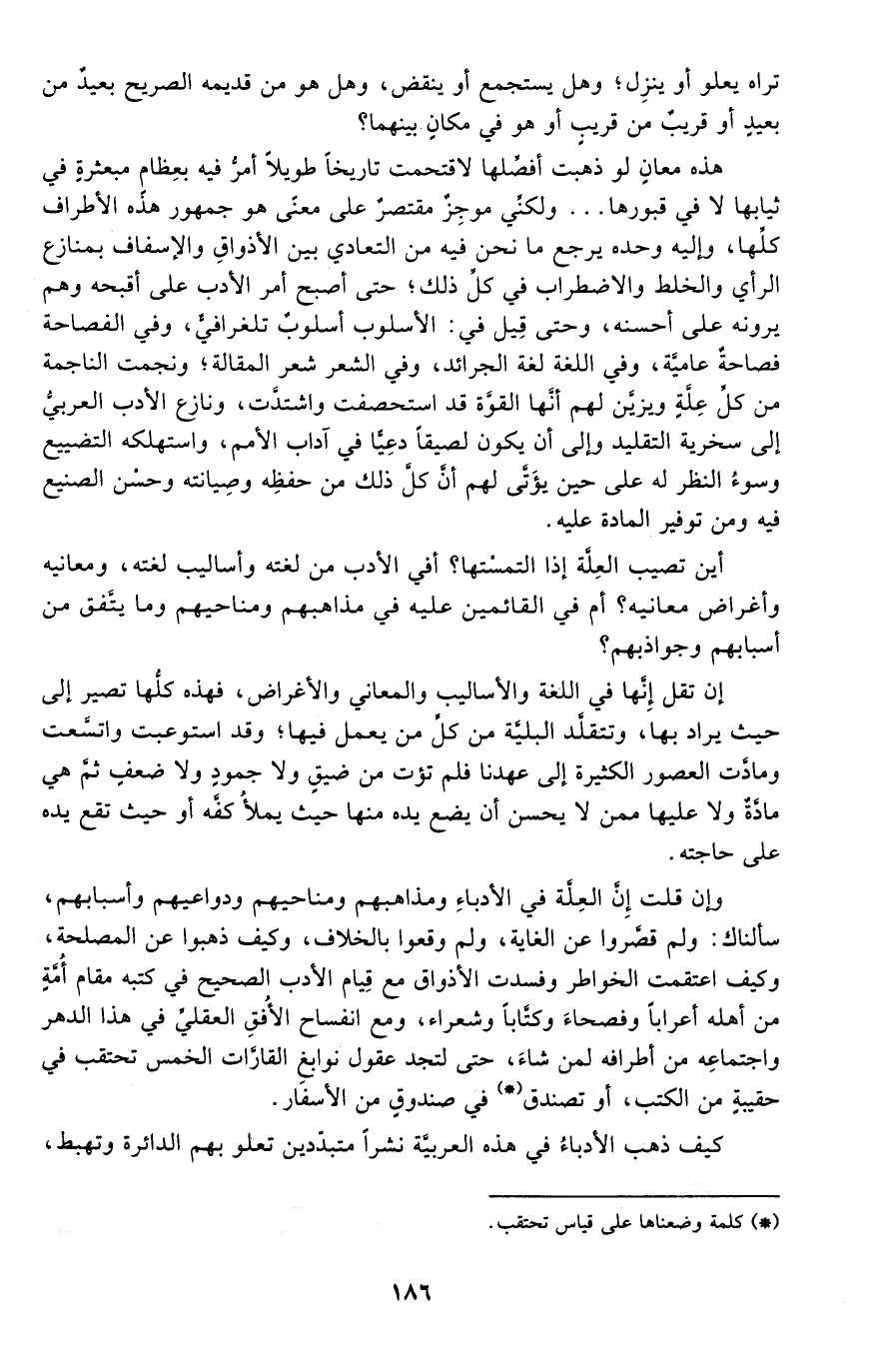 وإن قلت إن العلة في الأدباء ومذاهبهم ومناحيهم ودواعيهم وأسبابهم، سألناك: ولم قصروا عن الغاية، ولم وقعوا بالخلاف، وكيف ذهبوا عن المصلحة، وكيف اعتقمت الخواطر وفسدت الأذواق مع قيام الأدب الصحيح في كتبه مقام أمة من أهله أعرابًا وفصحاء وكتابًا وشعراء، ومع انفساح الأفق العقلي في هذا الدهر واجتماعه من أطرافه لمن شاء، حتى لتجد عقول نوابغ القارات الخمس تحتقب في حقيبة من الكتب، أو تصندق* في صندوق من الأسفار.