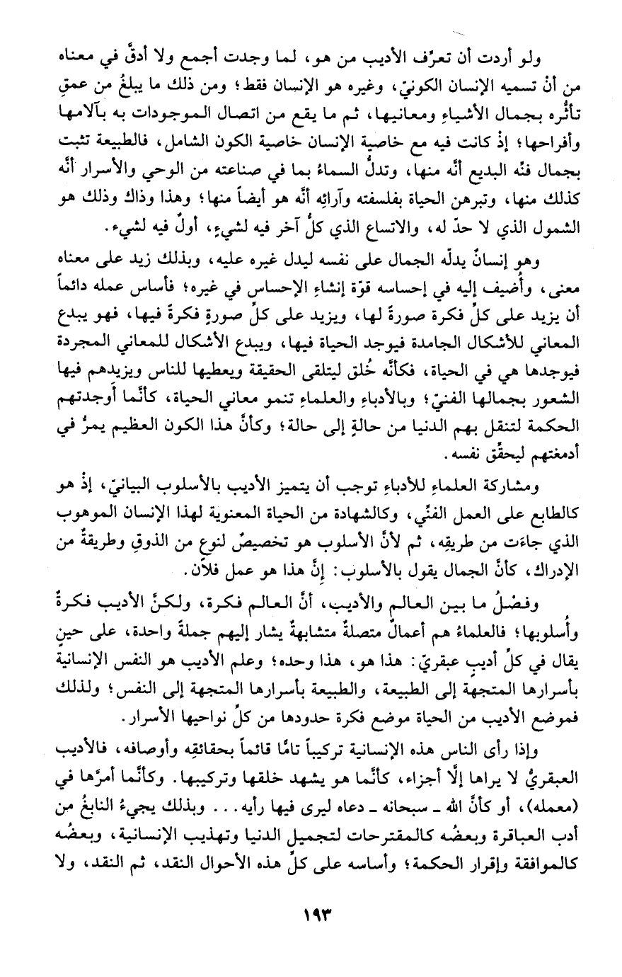 ولو أردت أن تعرف الأديب من هو، لما وجدت أجمع ولا أدق في معناه من أن تسميه الإنسان الكوني، وغيره هو الإنسان فقط؛ ومن ذلك ما يبلغ من عمق تأثره بجمال الأشياء ومعانيها، ثم ما يقع من اتصال الموجودات به بآلامها وأفراحها؛ إذ كانت فيه مع خاصة الإنسان خاصية الكون الشامل، فالطبيعة تثبت بجمال فنه البديع أنه منها، وتدل السماء بما في صناعته من الوحي والأسرار أنه كذلك منها، وتبرهن الحياة بفلسفته وآرائه أنه هو أيضًا منها؛ وهذا وذاك وذلك هو الشمول الذي لا حد له، والاتساع الذي كل آخر فيه لشيء، أولٌ فيه لشيء.