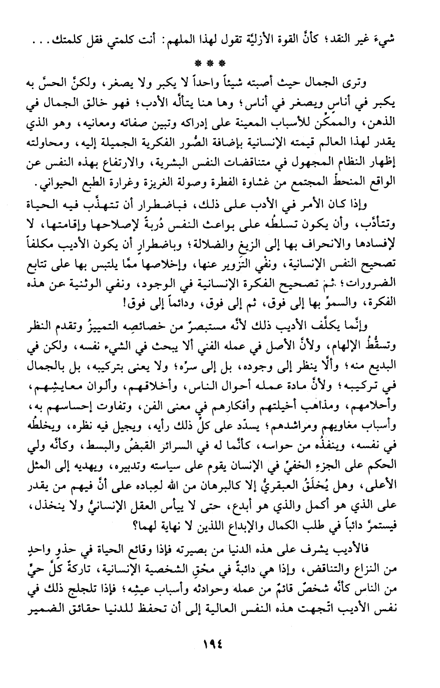 وترى الجمال حيث أصبته شيئًا واحدًا لا يكبر ولا يصغر، ولكن الحس به يكبر في أناس ويصغر في أناس؛ وها هنا يتأله الأدب؛ فهو خالق الجمال في الذهن، والممكن للأسباب المعينة على إدراكه وتبين صفاته ومعانيه، وهو الذي يقدر لهذا العالم قيمته الإنسانية بإضافة الصور الفكرية والجميلة إليه، ومحاولته إظهار النظام المجهول في متناقضات النفس البشرية، والارتفاع بهذه النفس عن الواقع المنحط المجتمع من غشاوة الفطرة وصولة الغريزة وغرارة الطبع الحيواني.