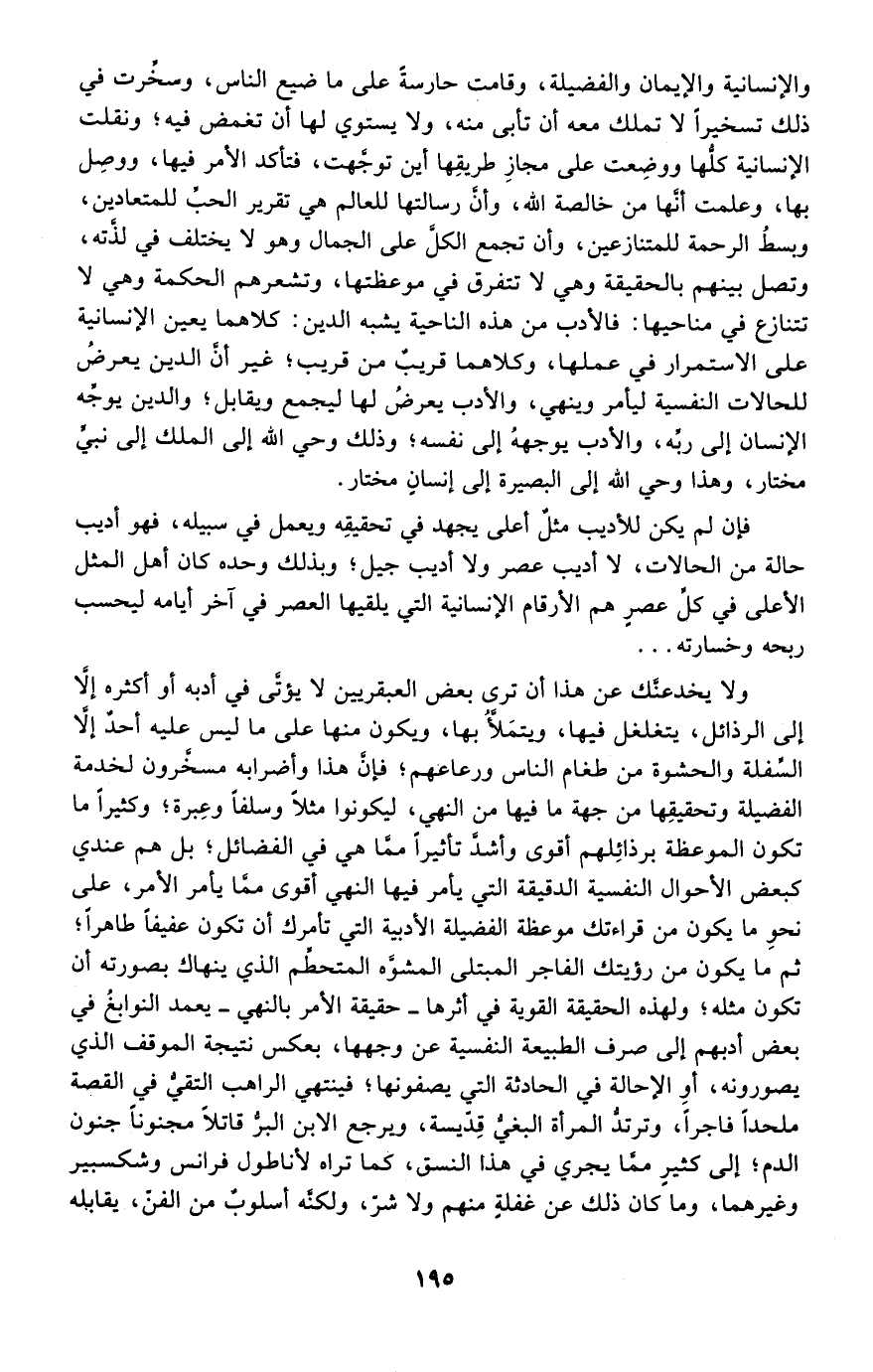 والإنسانية والإيمان والفضيلة، وقامت حارسة على ما ضيع الناس، وسخرت في ذلك تسخيرًا لا تملك معه أن تأبى منه، ولا يستوي لها أن تغمض فيه؛ ونقلت الإنسانية كلها ووضعت على مجاز طريقها أين توجهت، فتأكد الأمر فيها، ووصل بها، وعلمت أنها من خالصة الله، رسالتها للعالم هي تقرير الحب للمتعادين، وبسط الرحمة للمتنازعين، وأن تجمع الكل على الجمال وهو لا يختلف في لذته وتصل بينهم بالحقيقة وهي لا تتفرق في موعظتها، وتشعرهم الحكمة وهي لا تتنازع في مناحيها: فالأدب من هذه الناحية يشبه الدين: كلاهما يعين الإنسانية على الاستمرار في عملها، وكلاهما قريب من قريب؛ غير أن الدين يعرض للحالات النفسية ليأمر وينهي، والأدب يعرض لها ليجمع ويقابل؛ والدين يوجه الإنسان إلى ربه، والأدب يوجهه إلى نفسه؛ وذلك وحي الله إلى الملك إلى نبي مختار، وهذا وحي الله إلى البصيرة إلى إنسان مختار.
